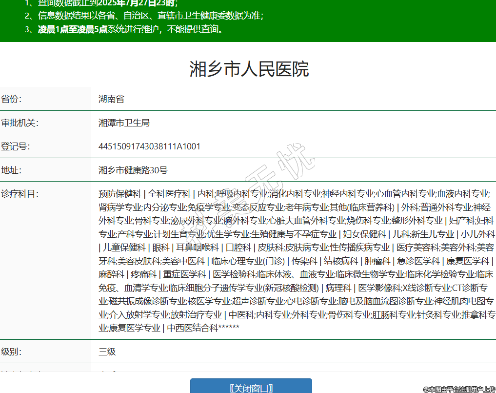 省份:湖南省審批機(jī)關(guān):湘潭市衛(wèi)生局登記號:44515091743038111A1001地址:湘鄉(xiāng)市健康路30號診療科目:預(yù)防保健科 | 全科醫(yī)療科 | 內(nèi)科;呼吸內(nèi)科專業(yè);消化內(nèi)科專業(yè);神經(jīng)內(nèi)科專業(yè);心血管內(nèi)科專業(yè);血液內(nèi)科專業(yè);腎病學(xué)專業(yè);內(nèi)分泌專業(yè);免疫學(xué)專業(yè);變態(tài)反應(yīng)專業(yè);老年病專業(yè);其他(臨床營養(yǎng)科) | 外科;普通外科專業(yè);神經(jīng)外科專業(yè);骨科專業(yè);泌尿外科專業(yè);胸外科專業(yè);心臟大血管外科專業(yè);燒傷科專業(yè);整形外科專業(yè) | 婦產(chǎn)科;婦科專業(yè);產(chǎn)科專業(yè);計劃生育專業(yè);優(yōu)生學(xué)專業(yè);生殖健康與不孕癥專業(yè) | 婦女保健科 | 兒科;新生兒專業(yè) | 小兒外科 | 兒童保健科 | 眼科 | 耳鼻咽喉科 | 口腔科 | 皮膚科;皮膚病專業(yè);性傳播疾病專業(yè) | 醫(yī)療美容科;美容外科;美容牙科;美容皮膚科;美容中醫(yī)科 | 臨床心理專業(yè)(門診) | 傳染科 | 結(jié)核病科 | 腫瘤科 | 急診醫(yī)學(xué)科 | 康復(fù)醫(yī)學(xué)科 | 麻醉科 | 疼痛科 | 重癥醫(yī)學(xué)科 | 醫(yī)學(xué)檢驗科;臨床體液、血液專業(yè);臨床微生物學(xué)專業(yè);臨床化學(xué)檢驗專業(yè);臨床免疫、血清學(xué)專業(yè);臨床細(xì)胞分子遺傳學(xué)專業(yè)(新冠核酸檢測) | 病理科 | 醫(yī)學(xué)影像科;X線診斷專業(yè);CT診斷專業(yè);磁共振成像診斷專業(yè);核醫(yī)學(xué)專業(yè);超聲診斷專業(yè);心電診斷專業(yè);腦電及腦血流圖診斷專業(yè);神經(jīng)肌肉電圖專業(yè);介入放射學(xué)專業(yè);放射治療專業(yè) | 中醫(yī)科;內(nèi)科專業(yè);外科專業(yè);骨傷科專業(yè);肛腸科專業(yè);針灸科專業(yè);推拿科專業(yè);康復(fù)醫(yī)學(xué)專業(yè) | 中西醫(yī)結(jié)合科******級別:三級法定代表人:李昕陽主要負(fù)責(zé)人:李昕陽執(zhí)業(yè)許可證有效期:2024/07/09 -至- 2037/11/29 -