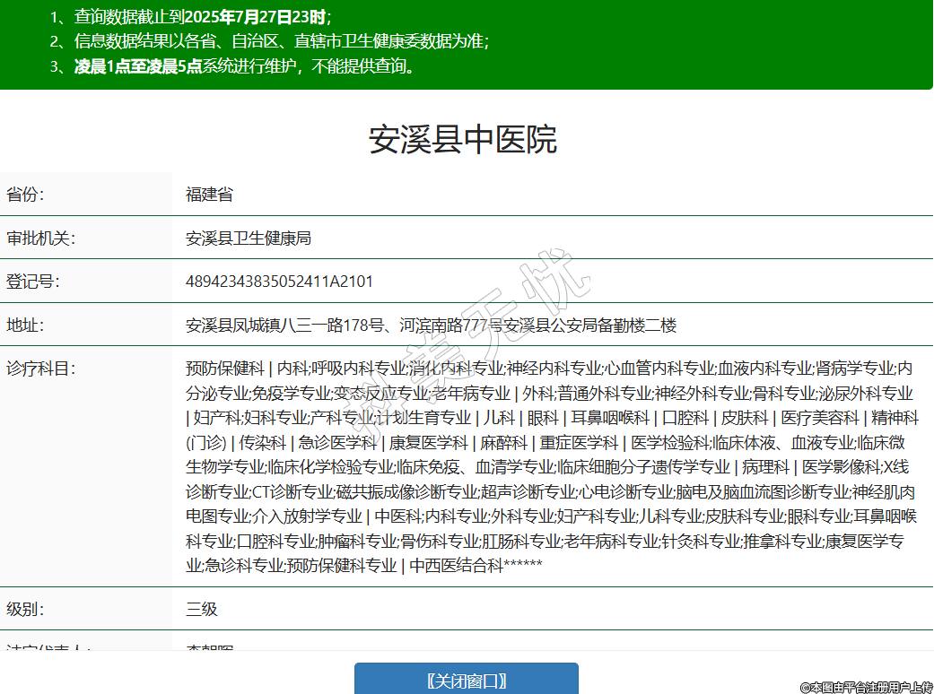 省份:福建省審批機(jī)關(guān):安溪縣衛(wèi)生健康局登記號(hào):48942343835052411A2101地址:安溪縣鳳城鎮(zhèn)八三一路178號(hào)、河濱南路777號(hào)安溪縣公安局備勤樓二樓診療科目:預(yù)防保健科 | 內(nèi)科;呼吸內(nèi)科專業(yè);消化內(nèi)科專業(yè);神經(jīng)內(nèi)科專業(yè);心血管內(nèi)科專業(yè);血液內(nèi)科專業(yè);腎病學(xué)專業(yè);內(nèi)分泌專業(yè);免疫學(xué)專業(yè);變態(tài)反應(yīng)專業(yè);老年病專業(yè) | 外科;普通外科專業(yè);神經(jīng)外科專業(yè);骨科專業(yè);泌尿外科專業(yè) | 婦產(chǎn)科;婦科專業(yè);產(chǎn)科專業(yè);計(jì)劃生育專業(yè) | 兒科 | 眼科 | 耳鼻咽喉科 | 口腔科 | 皮膚科 | 醫(yī)療美容科 | 精神科(門診) | 傳染科 | 急診醫(yī)學(xué)科 | 康復(fù)醫(yī)學(xué)科 | 麻醉科 | 重癥醫(yī)學(xué)科 | 醫(yī)學(xué)檢驗(yàn)科;臨床體液、血液專業(yè);臨床微生物學(xué)專業(yè);臨床化學(xué)檢驗(yàn)專業(yè);臨床免疫、血清學(xué)專業(yè);臨床細(xì)胞分子遺傳學(xué)專業(yè) | 病理科 | 醫(yī)學(xué)影像科;X線診斷專業(yè);CT診斷專業(yè);磁共振成像診斷專業(yè);超聲診斷專業(yè);心電診斷專業(yè);腦電及腦血流圖診斷專業(yè);神經(jīng)肌肉電圖專業(yè);介入放射學(xué)專業(yè) | 中醫(yī)科;內(nèi)科專業(yè);外科專業(yè);婦產(chǎn)科專業(yè);兒科專業(yè);皮膚科專業(yè);眼科專業(yè);耳鼻咽喉科專業(yè);口腔科專業(yè);腫瘤科專業(yè);骨傷科專業(yè);肛腸科專業(yè);老年病科專業(yè);針灸科專業(yè);推拿科專業(yè);康復(fù)醫(yī)學(xué)專業(yè);急診科專業(yè);預(yù)防保健科專業(yè) | 中西醫(yī)結(jié)合科******級(jí)別:三級(jí)法定代表人:李朝暉主要負(fù)責(zé)人:李朝暉執(zhí)業(yè)許可證有效期:2022/10/01 -至- 2028/09/30 -