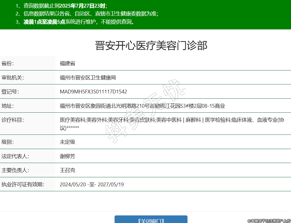 省份:福建省審批機(jī)關(guān):福州市晉安區(qū)衛(wèi)生健康局登記號:MAD9MH5FX35011117D1542地址:福州市晉安區(qū)象園街道北光明港路210號首融錦江花園S3#樓2層08-15商業(yè)診療科目:醫(yī)療美容科;美容外科;美容牙科;美容皮膚科;美容中醫(yī)科 | 麻醉科 | 醫(yī)學(xué)檢驗科;臨床體液、血液專業(yè)(協(xié)議)******級別:未定級法定代表人:謝柳芳主要負(fù)責(zé)人:王召克執(zhí)業(yè)許可證有效期:2024/05/20 -至- 2027/05/19 -