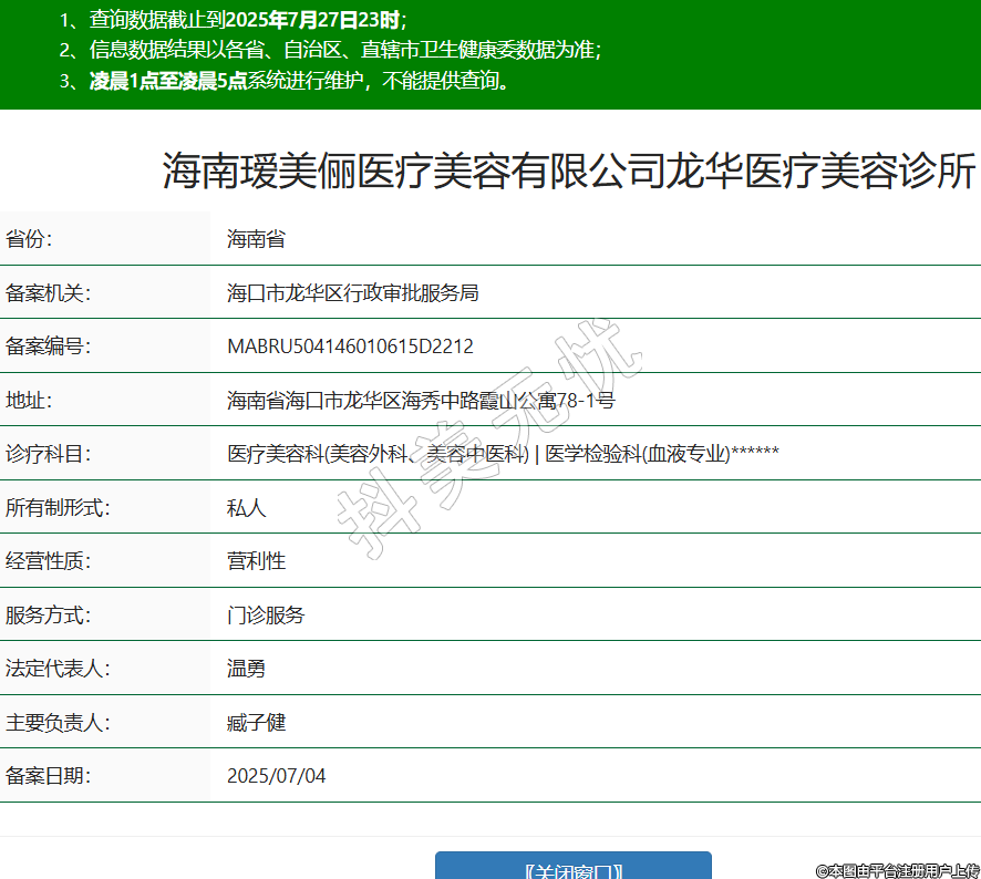 海南璦美儷醫(yī)療美容有限公司龍華醫(yī)療美容診所,診療科目:醫(yī)療美容科(美容外科、美容中醫(yī)科) | 醫(yī)學(xué)檢驗(yàn)科(血液專業(yè))******