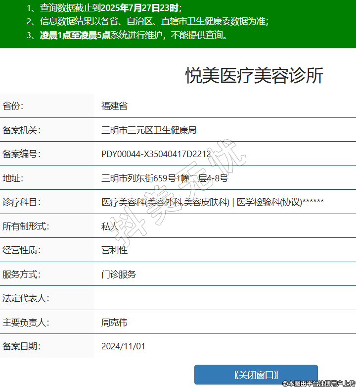 省份:福建省備案機(jī)關(guān):三明市三元區(qū)衛(wèi)生健康局備案編號(hào):PDY00044-X35040417D2212地址:三明市列東街659號(hào)1幢二層4-8號(hào)診療科目:醫(yī)療美容科(美容外科,美容皮膚科) | 醫(yī)學(xué)檢驗(yàn)科(協(xié)議)******所有制形式:私人經(jīng)營性質(zhì):營利性服務(wù)方式:門診服務(wù)法定代表人:主要負(fù)責(zé)人:周克偉備案日期:2024/11/01 -