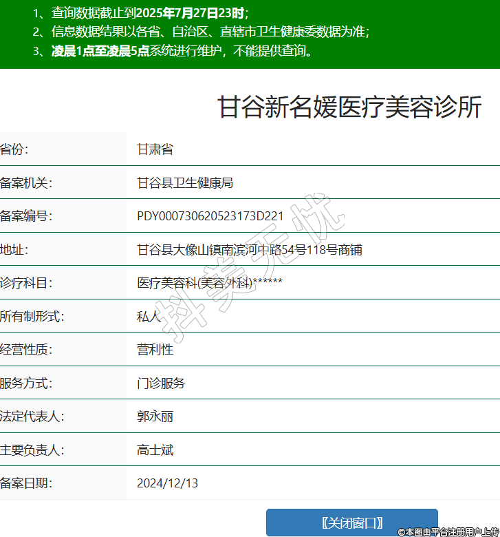 省份:甘肅省備案機關(guān):甘谷縣衛(wèi)生健康局備案編號:PDY000730620523173D221地址:甘谷縣大像山鎮(zhèn)南濱河中路54號118號商鋪診療科目:醫(yī)療美容科(美容外科)******所有制形式:私人經(jīng)營性質(zhì):營利性服務(wù)方式:門診服務(wù)法定代表人:郭永麗主要負責(zé)人:高士斌備案日期:2024/12/13 -