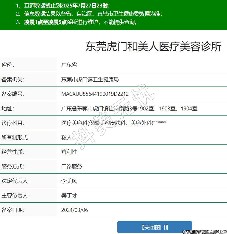 省份:廣東省備案機關:東莞市虎門鎮(zhèn)衛(wèi)生健康局備案編號:MACXUU85644190019D2212地址:廣東省東莞市虎門鎮(zhèn)社崗南路3號1902室、1903室、1904室診療科目:醫(yī)療美容科(僅限美容皮膚科、美容外科)******所有制形式:私人經(jīng)營性質(zhì):營利性服務方式:門診服務法定代表人:李美風主要負責人:樊丁才備案日期:2024/03/06 -
