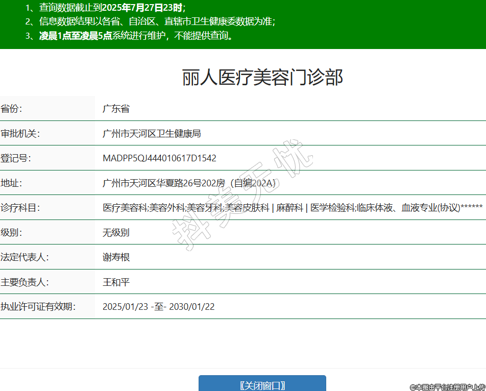省份:廣東省審批機(jī)關(guān):廣州市天河區(qū)衛(wèi)生健康局登記號:MADPP5QJ444010617D1542地址:廣州市天河區(qū)華夏路26號202房(自編202A)診療科目:醫(yī)療美容科;美容外科;美容牙科;美容皮膚科 | 麻醉科 | 醫(yī)學(xué)檢驗(yàn)科;臨床體液、血液專業(yè)(協(xié)議)******級別:無級別法定代表人:謝壽根主要負(fù)責(zé)人:王和平執(zhí)業(yè)許可證有效期:2025/01/23 -至- 2030/01/22 -