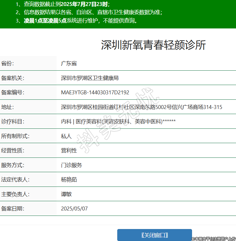 省份:廣東省備案機關:深圳市羅湖區(qū)衛(wèi)生健康局備案編號:MAE3YTGB-144030317D2192地址:深圳市羅湖區(qū)桂園街道紅村社區(qū)深南東路5002號信興廣場商場314-315診療科目:內科 | 醫(yī)療美容科(美容皮膚科、美容中醫(yī)科)******所有制形式:私人經營性質:營利性服務方式:門診服務法定代表人:楊艷茹主要負責人:譚敏備案日期:2025/05/07 -