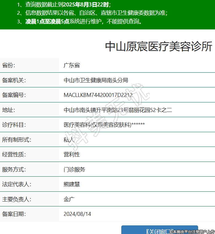 省份:廣東省備案機(jī)關(guān):中山市衛(wèi)生健康局南頭分局備案編號(hào):MACLLKBM744200017D2212地址:中山市南頭鎮(zhèn)升平南路23號(hào)翡麗花園52卡之二診療科目:醫(yī)療美容科(僅限美容皮膚科)******所有制形式:私人經(jīng)營性質(zhì):營利性服務(wù)方式:門診服務(wù)法定代表人:熊建慧主要負(fù)責(zé)人:金廣備案日期:2024/08/14 -