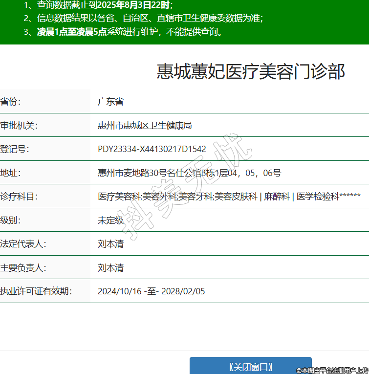 省份:廣東省審批機(jī)關(guān):惠州市惠城區(qū)衛(wèi)生健康局登記號:PDY23334-X44130217D1542地址:惠州市麥地路30號名仕公館B棟1層04,05,06號診療科目:醫(yī)療美容科;美容外科;美容牙科;美容皮膚科 | 麻醉科 | 醫(yī)學(xué)檢驗(yàn)科******級別:未定級法定代表人:劉本清主要負(fù)責(zé)人:劉本清執(zhí)業(yè)許可證有效期:2024/10/16 -至- 2028/02/05 -