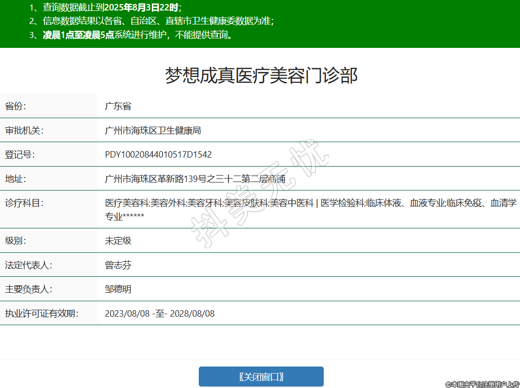 省份:廣東省審批機(jī)關(guān):廣州市海珠區(qū)衛(wèi)生健康局登記號(hào):PDY10020844010517D1542地址:廣州市海珠區(qū)革新路139號(hào)之三十二第二層商鋪診療科目:醫(yī)療美容科;美容外科;美容牙科;美容皮膚科;美容中醫(yī)科 | 醫(yī)學(xué)檢驗(yàn)科;臨床體液、血液專業(yè);臨床免疫、血清學(xué)專業(yè)******級(jí)別:未定級(jí)法定代表人:曾志芬主要負(fù)責(zé)人:鄒德明執(zhí)業(yè)許可證有效期:2023/08/08 -至- 2028/08/08 -