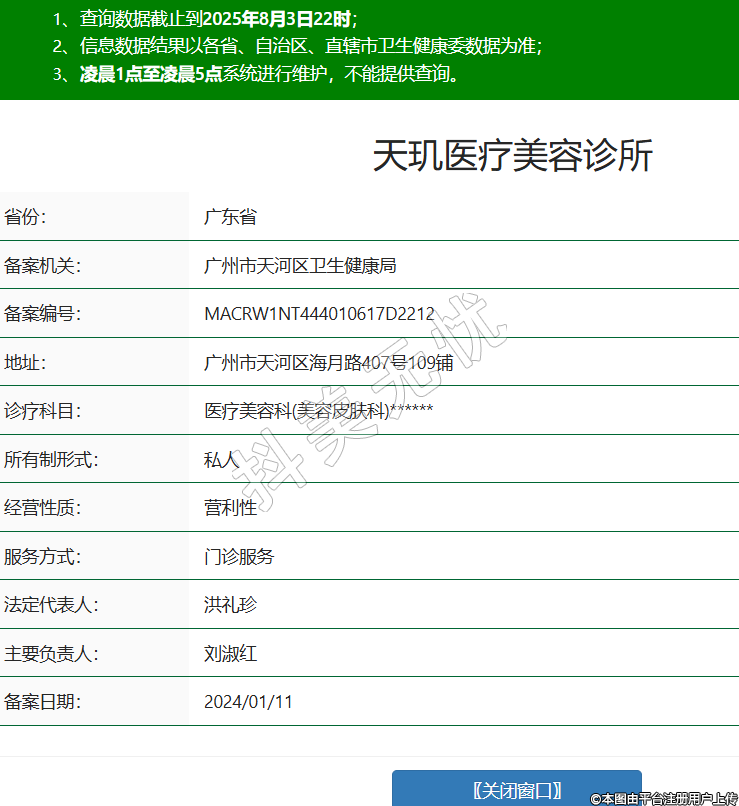 省份:廣東省備案機關:廣州市天河區(qū)衛(wèi)生健康局備案編號:MACRW1NT444010617D2212地址:廣州市天河區(qū)海月路407號109鋪診療科目:醫(yī)療美容科(美容皮膚科)******所有制形式:私人經(jīng)營性質(zhì):營利性服務方式:門診服務法定代表人:洪禮珍主要負責人:劉淑紅備案日期:2024/01/11 -