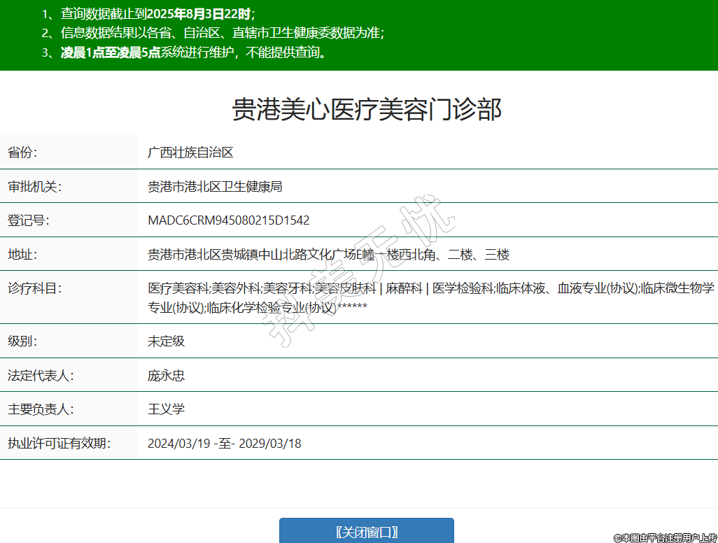 省份:廣西壯族自治區(qū)審批機(jī)關(guān):貴港市港北區(qū)衛(wèi)生健康局登記號:MADC6CRM945080215D1542地址:貴港市港北區(qū)貴城鎮(zhèn)中山北路文化廣場E幢一樓西北角、二樓、三樓診療科目:醫(yī)療美容科;美容外科;美容牙科;美容皮膚科 | 麻醉科 | 醫(yī)學(xué)檢驗科;臨床體液、血液專業(yè)(協(xié)議);臨床微生物學(xué)專業(yè)(協(xié)議);臨床化學(xué)檢驗專業(yè)(協(xié)議)******級別:未定級法定代表人:龐永忠主要負(fù)責(zé)人:王義學(xué)執(zhí)業(yè)許可證有效期:2024/03/19 -至- 2029/03/18 -
