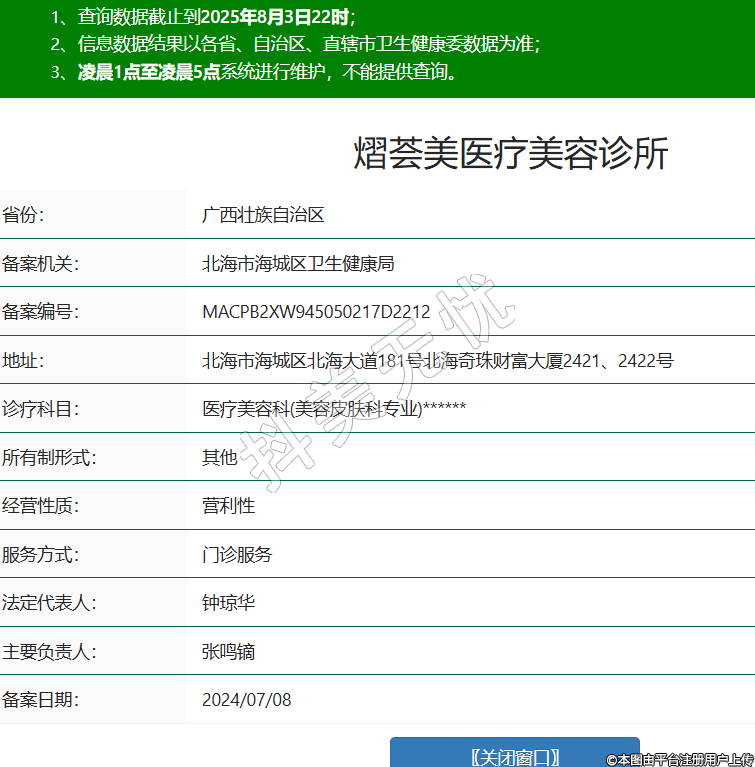 省份:廣西壯族自治區(qū)備案機關(guān):北海市海城區(qū)衛(wèi)生健康局備案編號:MACPB2XW945050217D2212地址:北海市海城區(qū)北海大道181號北海奇珠財富大廈2421、2422號診療科目:醫(yī)療美容科(美容皮膚科專業(yè))******所有制形式:其他經(jīng)營性質(zhì):營利性服務(wù)方式:門診服務(wù)法定代表人:鐘瓊?cè)A主要負(fù)責(zé)人:張鳴鏑備案日期:2024/07/08 -