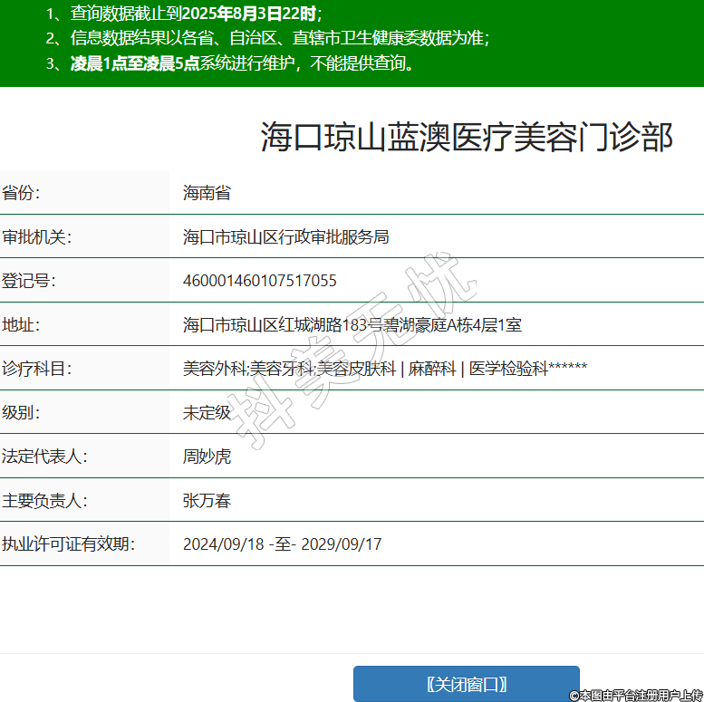 省份:海南省審批機關:??谑协偵絽^(qū)行政審批服務局登記號:460001460107517055地址:??谑协偵絽^(qū)紅城湖路183號碧湖豪庭A棟4層1室診療科目:美容外科;美容牙科;美容皮膚科 | 麻醉科 | 醫(yī)學檢驗科******級別:未定級法定代表人:周妙虎主要負責人:張萬春執(zhí)業(yè)許可證有效期:2024/09/18 -至- 2029/09/17 -