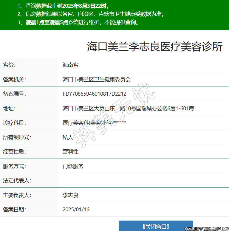 省份:海南省備案機(jī)關(guān):??谑忻捞m區(qū)衛(wèi)生健康委員會(huì)備案編號(hào):PDY70865946010817D2212地址:??谑忻捞m區(qū)大英山東一路10號(hào)國(guó)瑞城辦公樓6層1-601房診療科目:醫(yī)療美容科(美容外科)******所有制形式:私人經(jīng)營(yíng)性質(zhì):營(yíng)利性服務(wù)方式:門診服務(wù)法定代表人:主要負(fù)責(zé)人:李志良備案日期:2025/01/16 -