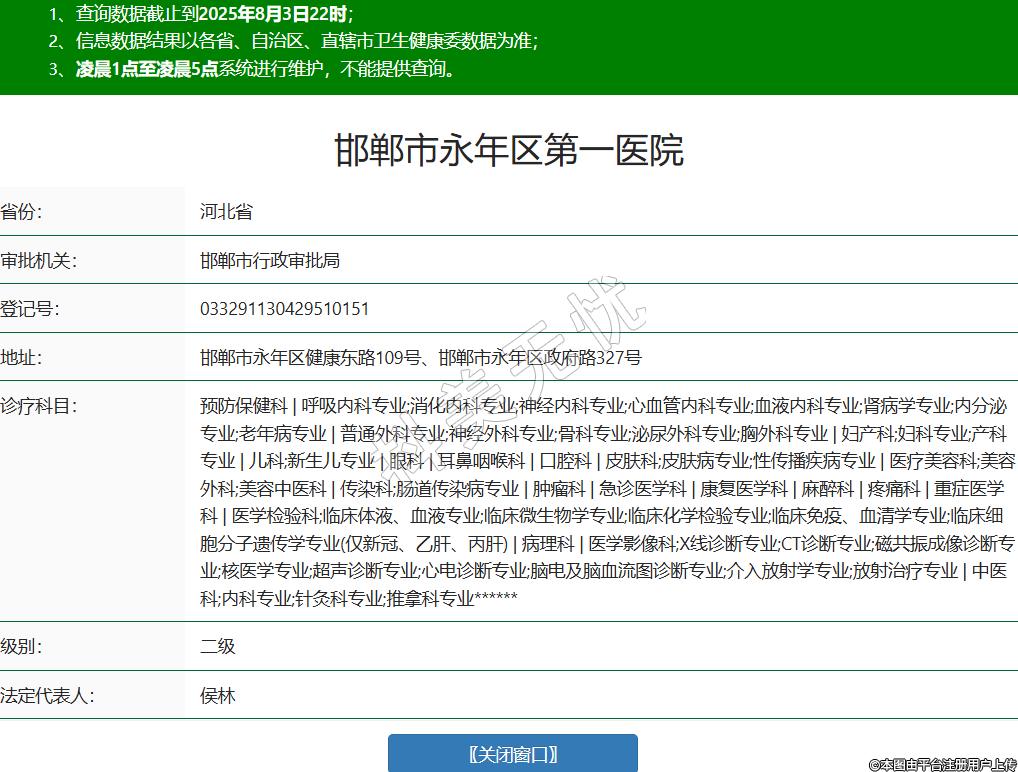 省份:河北省審批機(jī)關(guān):邯鄲市行政審批局登記號:033291130429510151地址:邯鄲市永年區(qū)健康東路109號、邯鄲市永年區(qū)政府路327號診療科目:預(yù)防保健科 | 呼吸內(nèi)科專業(yè);消化內(nèi)科專業(yè);神經(jīng)內(nèi)科專業(yè);心血管內(nèi)科專業(yè);血液內(nèi)科專業(yè);腎病學(xué)專業(yè);內(nèi)分泌專業(yè);老年病專業(yè) | 普通外科專業(yè);神經(jīng)外科專業(yè);骨科專業(yè);泌尿外科專業(yè);胸外科專業(yè) | 婦產(chǎn)科;婦科專業(yè);產(chǎn)科專業(yè) | 兒科;新生兒專業(yè) | 眼科 | 耳鼻咽喉科 | 口腔科 | 皮膚科;皮膚病專業(yè);性傳播疾病專業(yè) | 醫(yī)療美容科;美容外科;美容中醫(yī)科 | 傳染科;腸道傳染病專業(yè) | 腫瘤科 | 急診醫(yī)學(xué)科 | 康復(fù)醫(yī)學(xué)科 | 麻醉科 | 疼痛科 | 重癥醫(yī)學(xué)科 | 醫(yī)學(xué)檢驗科;臨床體液、血液專業(yè);臨床微生物學(xué)專業(yè);臨床化學(xué)檢驗專業(yè);臨床免疫、血清學(xué)專業(yè);臨床細(xì)胞分子遺傳學(xué)專業(yè)(僅新冠、乙肝、丙肝) | 病理科 | 醫(yī)學(xué)影像科;X線診斷專業(yè);CT診斷專業(yè);磁共振成像診斷專業(yè);核醫(yī)學(xué)專業(yè);超聲診斷專業(yè);心電診斷專業(yè);腦電及腦血流圖診斷專業(yè);介入放射學(xué)專業(yè);放射治療專業(yè) | 中醫(yī)科;內(nèi)科專業(yè);針灸科專業(yè);推拿科專業(yè)******級別:二級法定代表人:侯林主要負(fù)責(zé)人:侯林執(zhí)業(yè)許可證有效期:2015/05/15 -至- 2030/05/15 -