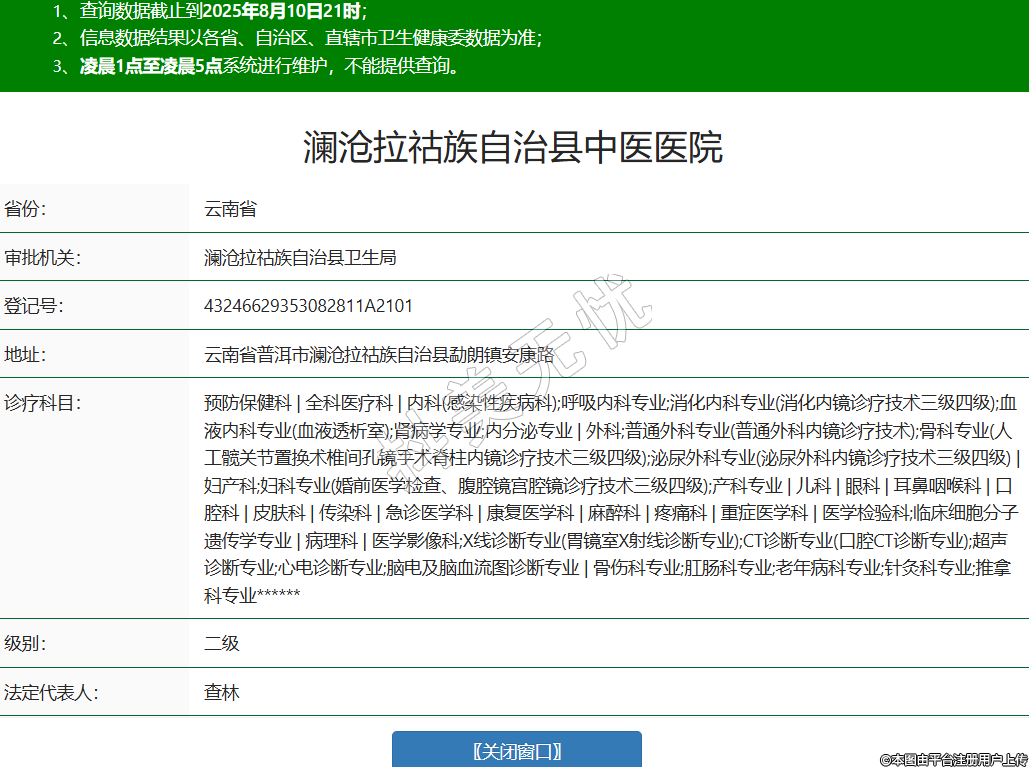 省份:云南省審批機(jī)關(guān):瀾滄拉祜族自治縣衛(wèi)生局登記號(hào):43246629353082811A2101地址:云南省普洱市瀾滄拉祜族自治縣勐朗鎮(zhèn)安康路診療科目:預(yù)防保健科 | 全科醫(yī)療科 | 內(nèi)科(感染性疾病科);呼吸內(nèi)科專(zhuān)業(yè);消化內(nèi)科專(zhuān)業(yè)(消化內(nèi)鏡診療技術(shù)三級(jí)四級(jí));血液內(nèi)科專(zhuān)業(yè)(血液透析室);腎病學(xué)專(zhuān)業(yè);內(nèi)分泌專(zhuān)業(yè) | 外科;普通外科專(zhuān)業(yè)(普通外科內(nèi)鏡診療技術(shù));骨科專(zhuān)業(yè)(人工髖關(guān)節(jié)置換術(shù)椎間孔鏡手術(shù)脊柱內(nèi)鏡診療技術(shù)三級(jí)四級(jí));泌尿外科專(zhuān)業(yè)(泌尿外科內(nèi)鏡診療技術(shù)三級(jí)四級(jí)) | 婦產(chǎn)科;婦科專(zhuān)業(yè)(婚前醫(yī)學(xué)檢查、腹腔鏡宮腔鏡診療技術(shù)三級(jí)四級(jí));產(chǎn)科專(zhuān)業(yè) | 兒科 | 眼科 | 耳鼻咽喉科 | 口腔科 | 皮膚科 | 傳染科 | 急診醫(yī)學(xué)科 | 康復(fù)醫(yī)學(xué)科 | 麻醉科 | 疼痛科 | 重癥醫(yī)學(xué)科 | 醫(yī)學(xué)檢驗(yàn)科;臨床細(xì)胞分子遺傳學(xué)專(zhuān)業(yè) | 病理科 | 醫(yī)學(xué)影像科;X線(xiàn)診斷專(zhuān)業(yè)(胃鏡室X射線(xiàn)診斷專(zhuān)業(yè));CT診斷專(zhuān)業(yè)(口腔CT診斷專(zhuān)業(yè));超聲診斷專(zhuān)業(yè);心電診斷專(zhuān)業(yè);腦電及腦血流圖診斷專(zhuān)業(yè) | 骨傷科專(zhuān)業(yè);肛腸科專(zhuān)業(yè);老年病科專(zhuān)業(yè);針灸科專(zhuān)業(yè);推拿科專(zhuān)業(yè)******級(jí)別:二級(jí)法定代表人:查林主要負(fù)責(zé)人:查林執(zhí)業(yè)許可證有效期:2018/09/12 -至- 2033/09/12 -
