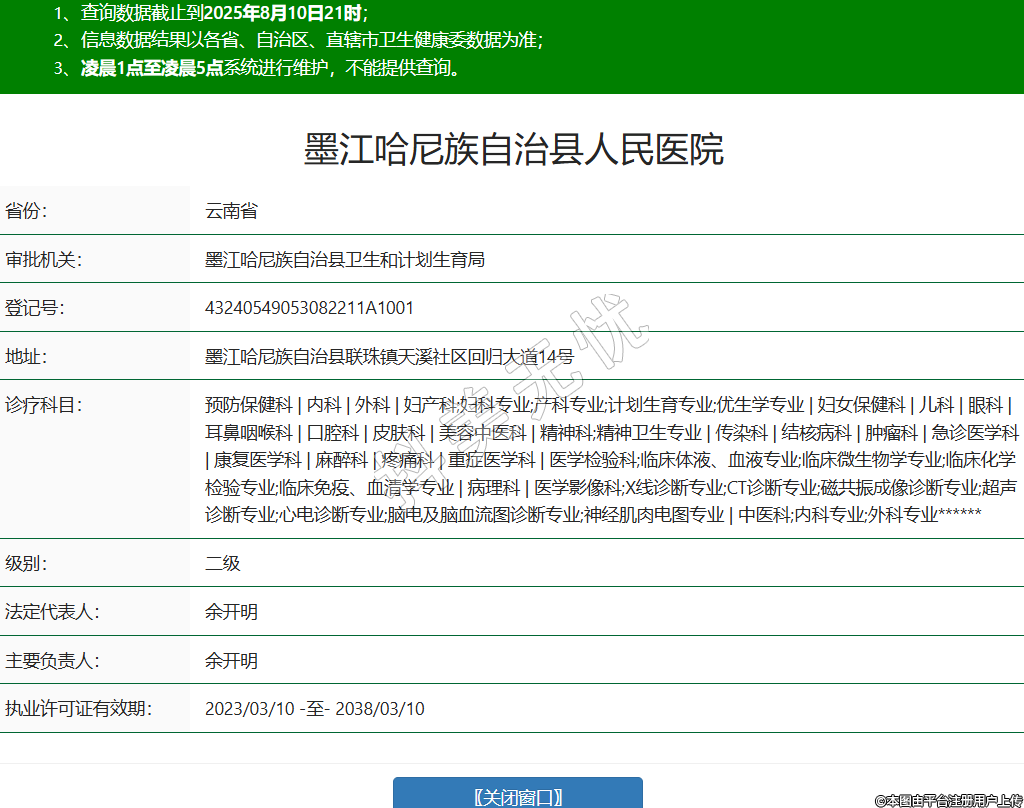 省份:云南省審批機關(guān):墨江哈尼族自治縣衛(wèi)生和計劃生育局登記號:43240549053082211A1001地址:墨江哈尼族自治縣聯(lián)珠鎮(zhèn)天溪社區(qū)回歸大道14號診療科目:預(yù)防保健科 | 內(nèi)科 | 外科 | 婦產(chǎn)科;婦科專業(yè);產(chǎn)科專業(yè);計劃生育專業(yè);優(yōu)生學(xué)專業(yè) | 婦女保健科 | 兒科 | 眼科 | 耳鼻咽喉科 | 口腔科 | 皮膚科 | 美容中醫(yī)科 | 精神科;精神衛(wèi)生專業(yè) | 傳染科 | 結(jié)核病科 | 腫瘤科 | 急診醫(yī)學(xué)科 | 康復(fù)醫(yī)學(xué)科 | 麻醉科 | 疼痛科 | 重癥醫(yī)學(xué)科 | 醫(yī)學(xué)檢驗科;臨床體液、血液專業(yè);臨床微生物學(xué)專業(yè);臨床化學(xué)檢驗專業(yè);臨床免疫、血清學(xué)專業(yè) | 病理科 | 醫(yī)學(xué)影像科;X線診斷專業(yè);CT診斷專業(yè);磁共振成像診斷專業(yè);超聲診斷專業(yè);心電診斷專業(yè);腦電及腦血流圖診斷專業(yè);神經(jīng)肌肉電圖專業(yè) | 中醫(yī)科;內(nèi)科專業(yè);外科專業(yè)******級別:二級法定代表人:余開明主要負責(zé)人:余開明執(zhí)業(yè)許可證有效期:2023/03/10 -至- 2038/03/10 -
