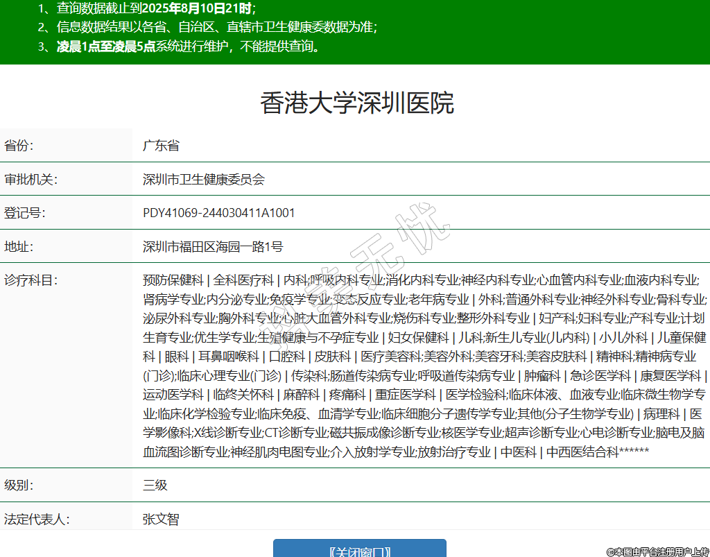 省份:廣東省審批機關:深圳市衛(wèi)生健康委員會登記號:PDY41069-244030411A1001地址:深圳市福田區(qū)海園一路1號診療科目:預防保健科 | 全科醫(yī)療科 | 內(nèi)科;呼吸內(nèi)科專業(yè);消化內(nèi)科專業(yè);神經(jīng)內(nèi)科專業(yè);心血管內(nèi)科專業(yè);血液內(nèi)科專業(yè);腎病學專業(yè);內(nèi)分泌專業(yè);免疫學專業(yè);變態(tài)反應專業(yè);老年病專業(yè) | 外科;普通外科專業(yè);神經(jīng)外科專業(yè);骨科專業(yè);泌尿外科專業(yè);胸外科專業(yè);心臟大血管外科專業(yè);燒傷科專業(yè);整形外科專業(yè) | 婦產(chǎn)科;婦科專業(yè);產(chǎn)科專業(yè);計劃生育專業(yè);優(yōu)生學專業(yè);生殖健康與不孕癥專業(yè) | 婦女保健科 | 兒科;新生兒專業(yè)(兒內(nèi)科) | 小兒外科 | 兒童保健科 | 眼科 | 耳鼻咽喉科 | 口腔科 | 皮膚科 | 醫(yī)療美容科;美容外科;美容牙科;美容皮膚科 | 精神科;精神病專業(yè)(門診);臨床心理專業(yè)(門診) | 傳染科;腸道傳染病專業(yè);呼吸道傳染病專業(yè) | 腫瘤科 | 急診醫(yī)學科 | 康復醫(yī)學科 | 運動醫(yī)學科 | 臨終關懷科 | 麻醉科 | 疼痛科 | 重癥醫(yī)學科 | 醫(yī)學檢驗科;臨床體液、血液專業(yè);臨床微生物學專業(yè);臨床化學檢驗專業(yè);臨床免疫、血清學專業(yè);臨床細胞分子遺傳學專業(yè);其他(分子生物學專業(yè)) | 病理科 | 醫(yī)學影像科;X線診斷專業(yè);CT診斷專業(yè);磁共振成像診斷專業(yè);核醫(yī)學專業(yè);超聲診斷專業(yè);心電診斷專業(yè);腦電及腦血流圖診斷專業(yè);神經(jīng)肌肉電圖專業(yè);介入放射學專業(yè);放射治療專業(yè) | 中醫(yī)科 | 中西醫(yī)結合科******級別:三級法定代表人:張文智主要負責人:***執(zhí)業(yè)許可證有效期:2021/11/05 -至- 2036/11/04 -