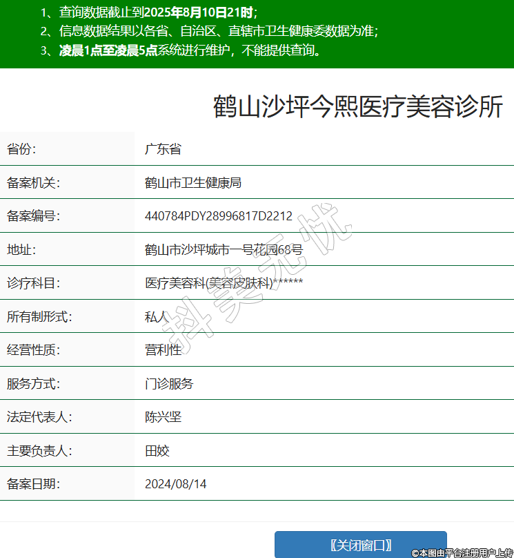 省份:廣東省備案機關(guān):鶴山市衛(wèi)生健康局備案編號:440784PDY28996817D2212地址:鶴山市沙坪城市一號花園68號診療科目:醫(yī)療美容科(美容皮膚科)******所有制形式:私人經(jīng)營性質(zhì):營利性服務方式:門診服務法定代表人:陳興堅主要負責人:田姣備案日期:2024/08/14 -