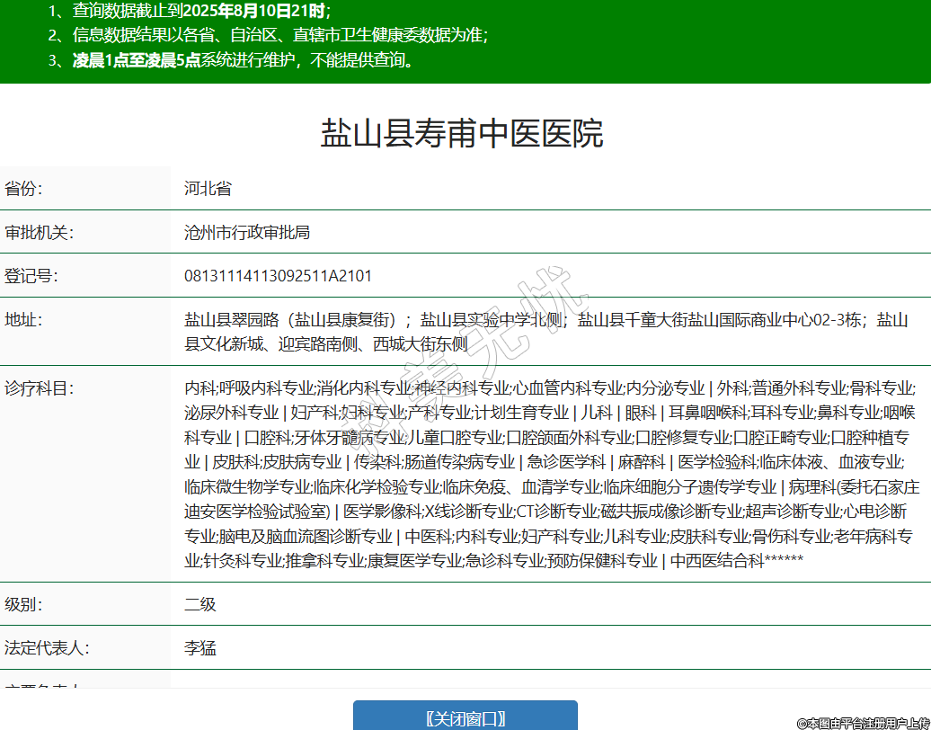省份:河北省審批機(jī)關(guān):滄州市行政審批局登記號(hào):08131114113092511A2101地址:鹽山縣翠園路(鹽山縣康復(fù)街);鹽山縣實(shí)驗(yàn)中學(xué)北側(cè);鹽山縣千童大街鹽山國(guó)際商業(yè)中心02-3棟;鹽山縣文化新城、迎賓路南側(cè)、西城大街東側(cè)診療科目:內(nèi)科;呼吸內(nèi)科專(zhuān)業(yè);消化內(nèi)科專(zhuān)業(yè);神經(jīng)內(nèi)科專(zhuān)業(yè);心血管內(nèi)科專(zhuān)業(yè);內(nèi)分泌專(zhuān)業(yè) | 外科;普通外科專(zhuān)業(yè);骨科專(zhuān)業(yè);泌尿外科專(zhuān)業(yè) | 婦產(chǎn)科;婦科專(zhuān)業(yè);產(chǎn)科專(zhuān)業(yè);計(jì)劃生育專(zhuān)業(yè) | 兒科 | 眼科 | 耳鼻咽喉科;耳科專(zhuān)業(yè);鼻科專(zhuān)業(yè);咽喉科專(zhuān)業(yè) | 口腔科;牙體牙髓病專(zhuān)業(yè);兒童口腔專(zhuān)業(yè);口腔頜面外科專(zhuān)業(yè);口腔修復(fù)專(zhuān)業(yè);口腔正畸專(zhuān)業(yè);口腔種植專(zhuān)業(yè) | 皮膚科;皮膚病專(zhuān)業(yè) | 傳染科;腸道傳染病專(zhuān)業(yè) | 急診醫(yī)學(xué)科 | 麻醉科 | 醫(yī)學(xué)檢驗(yàn)科;臨床體液、血液專(zhuān)業(yè);臨床微生物學(xué)專(zhuān)業(yè);臨床化學(xué)檢驗(yàn)專(zhuān)業(yè);臨床免疫、血清學(xué)專(zhuān)業(yè);臨床細(xì)胞分子遺傳學(xué)專(zhuān)業(yè) | 病理科(委托石家莊迪安醫(yī)學(xué)檢驗(yàn)試驗(yàn)室) | 醫(yī)學(xué)影像科;X線(xiàn)診斷專(zhuān)業(yè);CT診斷專(zhuān)業(yè);磁共振成像診斷專(zhuān)業(yè);超聲診斷專(zhuān)業(yè);心電診斷專(zhuān)業(yè);腦電及腦血流圖診斷專(zhuān)業(yè) | 中醫(yī)科;內(nèi)科專(zhuān)業(yè);婦產(chǎn)科專(zhuān)業(yè);兒科專(zhuān)業(yè);皮膚科專(zhuān)業(yè);骨傷科專(zhuān)業(yè);老年病科專(zhuān)業(yè);針灸科專(zhuān)業(yè);推拿科專(zhuān)業(yè);康復(fù)醫(yī)學(xué)專(zhuān)業(yè);急診科專(zhuān)業(yè);預(yù)防保健科專(zhuān)業(yè) | 中西醫(yī)結(jié)合科******級(jí)別:二級(jí)法定代表人:李猛主要負(fù)責(zé)人:執(zhí)業(yè)許可證有效期:2020/12/21 -至- 2025/12/20 -
