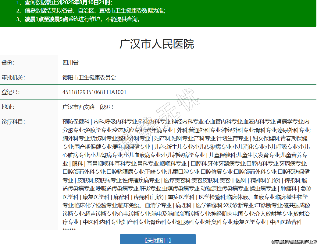 省份:四川省審批機關:德陽市衛(wèi)生健康委員會登記號:45118129351068111A1001地址:廣漢市西安路三段9號診療科目:預防保健科 | 內科;呼吸內科專業(yè);消化內科專業(yè);神經(jīng)內科專業(yè);心血管內科專業(yè);血液內科專業(yè);腎病學專業(yè);內分泌專業(yè);免疫學專業(yè);變態(tài)反應專業(yè);老年病專業(yè) | 外科;普通外科專業(yè);神經(jīng)外科專業(yè);骨科專業(yè);泌尿外科專業(yè);胸外科專業(yè);燒傷科專業(yè);整形外科專業(yè) | 婦產(chǎn)科;婦科專業(yè);產(chǎn)科專業(yè);計劃生育專業(yè) | 婦女保健科;青春期保健專業(yè);圍產(chǎn)期保健專業(yè);更年期保健專業(yè) | 兒科;新生兒專業(yè);小兒傳染病專業(yè);小兒消化專業(yè);小兒呼吸專業(yè);小兒心臟病專業(yè);小兒腎病專業(yè);小兒血液病專業(yè);小兒神經(jīng)病學專業(yè) | 兒童保健科;兒童生長發(fā)育專業(yè);兒童營養(yǎng)專業(yè) | 眼科 | 耳鼻咽喉科;耳科專業(yè);鼻科專業(yè);咽喉科專業(yè) | 口腔科;牙體牙髓病專業(yè);口腔內科專業(yè);牙周病專業(yè);口腔頜面外科專業(yè);口腔粘膜病專業(yè);正畸專業(yè);兒童口腔專業(yè);口腔修復專業(yè);口腔頜面外科專業(yè);口腔預防保健專業(yè) | 皮膚科;皮膚病專業(yè);性傳播疾病專業(yè) | 醫(yī)療美容科;美容皮膚科;美容中醫(yī)科 | 精神科(門診) | 傳染科;腸道傳染病專業(yè);呼吸道傳染病專業(yè);肝炎專業(yè);蟲媒傳染病專業(yè);動物源性傳染病專業(yè);蠕蟲病專業(yè) | 腫瘤科 | 急診醫(yī)學科 | 康復醫(yī)學科 | 麻醉科 | 疼痛科(門診) | 重癥醫(yī)學科 | 醫(yī)學檢驗科;臨床體液、血液專業(yè);臨床微生物學專業(yè);臨床化學檢驗專業(yè);臨床免疫、血清學專業(yè) | 病理科 | 醫(yī)學影像科;X線診斷專業(yè);CT診斷專業(yè);磁共振成像診斷專業(yè);超聲診斷專業(yè);心電診斷專業(yè);腦電及腦血流圖診斷專業(yè);神經(jīng)肌肉電圖專業(yè);介入放射學專業(yè);放射治療專業(yè) | 中醫(yī)科;內科專業(yè);婦產(chǎn)科專業(yè);骨傷科專業(yè);肛腸科專業(yè);針灸科專業(yè);康復醫(yī)學專業(yè) | 中西醫(yī)結合科******級別:三級法定代表人:呂波主要負責人:呂波執(zhí)業(yè)許可證有效期:2017/12/26 -至- 2032/12/25 -