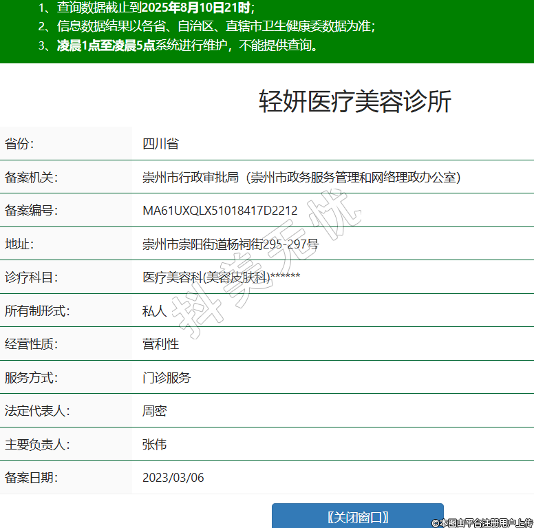 省份:四川省備案機(jī)關(guān):崇州市行政審批局(崇州市政務(wù)服務(wù)管理和網(wǎng)絡(luò)理政辦公室)備案編號(hào):MA61UXQLX51018417D2212地址:崇州市崇陽街道楊祠街295-297號(hào)診療科目:醫(yī)療美容科(美容皮膚科)******所有制形式:私人經(jīng)營性質(zhì):營利性服務(wù)方式:門診服務(wù)法定代表人:周密主要負(fù)責(zé)人:張偉備案日期:2023/03/06 -
