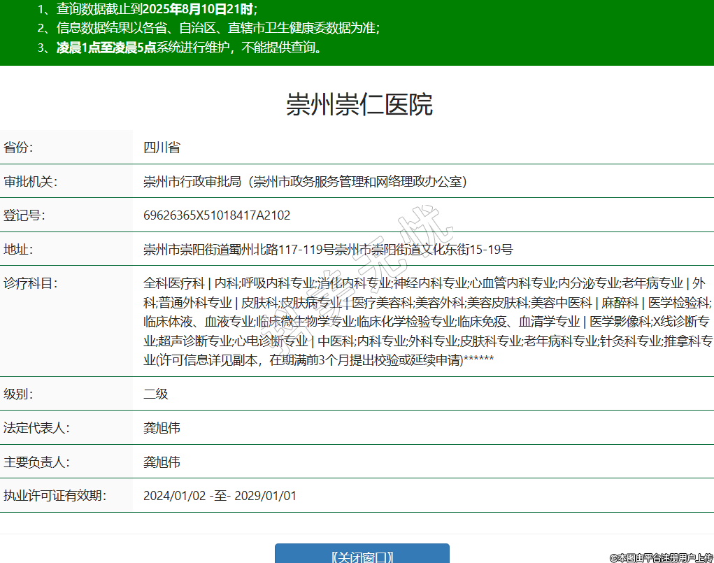 崇州崇仁醫(yī)院,診療科目:全科醫(yī)療科 | 內科;呼吸內科專業(yè);消化內科專業(yè);神經內科專業(yè);心血管內科專業(yè);內分泌專業(yè);老年病專業(yè) | 外科;普通外科專業(yè) | 皮膚科;皮膚病專業(yè) | 醫(yī)療美容科;美容外科;美容皮膚科;美容中醫(yī)科 | 麻醉科 | 醫(yī)學檢驗科;外科專業(yè);皮膚科專業(yè);老年病科專業(yè);針灸科專業(yè);推拿科專業(yè)(許可信息詳見副本,在期滿前3個月提出校驗或延續(xù)申請)******