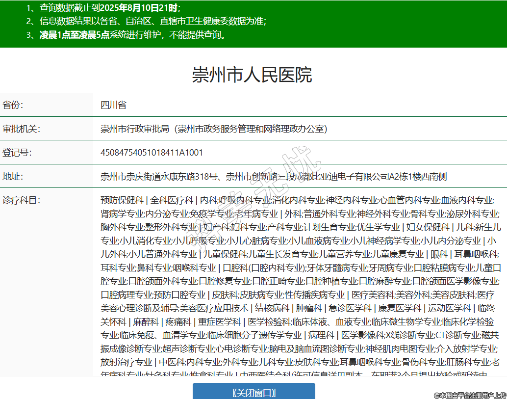 省份:四川省審批機(jī)關(guān):崇州市行政審批局(崇州市政務(wù)服務(wù)管理和網(wǎng)絡(luò)理政辦公室)登記號(hào):45084754051018411A1001地址:崇州市崇慶街道永康東路318號(hào)、崇州市創(chuàng)新路三段成都比亞迪電子有限公司A2棟1樓西南側(cè)診療科目:預(yù)防保健科 | 全科醫(yī)療科 | 內(nèi)科;呼吸內(nèi)科專業(yè);消化內(nèi)科專業(yè);神經(jīng)內(nèi)科專業(yè);心血管內(nèi)科專業(yè);血液內(nèi)科專業(yè);腎病學(xué)專業(yè);內(nèi)分泌專業(yè);免疫學(xué)專業(yè);老年病專業(yè) | 外科;普通外科專業(yè);神經(jīng)外科專業(yè);骨科專業(yè);泌尿外科專業(yè);胸外科專業(yè);整形外科專業(yè) | 婦產(chǎn)科;婦科專業(yè);產(chǎn)科專業(yè);計(jì)劃生育專業(yè);優(yōu)生學(xué)專業(yè) | 婦女保健科 | 兒科;新生兒專業(yè);小兒消化專業(yè);小兒呼吸專業(yè);小兒心臟病專業(yè);小兒血液病專業(yè);小兒神經(jīng)病學(xué)專業(yè);小兒內(nèi)分泌專業(yè) | 小兒外科;小兒普通外科專業(yè) | 兒童保健科;兒童生長(zhǎng)發(fā)育專業(yè);兒童營(yíng)養(yǎng)專業(yè);兒童康復(fù)專業(yè) | 眼科 | 耳鼻咽喉科;耳科專業(yè);鼻科專業(yè);咽喉科專業(yè) | 口腔科(口腔內(nèi)科專業(yè));牙體牙髓病專業(yè);牙周病專業(yè);口腔粘膜病專業(yè);兒童口腔專業(yè);口腔頜面外科專業(yè);口腔修復(fù)專業(yè);口腔正畸專業(yè);口腔種植專業(yè);口腔麻醉專業(yè);口腔頜面醫(yī)學(xué)影像專業(yè);口腔病理專業(yè);預(yù)防口腔專業(yè) | 皮膚科;皮膚病專業(yè);性傳播疾病專業(yè) | 醫(yī)療美容科;美容外科;美容皮膚科;醫(yī)療美容心理診斷及輔導(dǎo);美容醫(yī)療應(yīng)用技術(shù) | 結(jié)核病科 | 腫瘤科 | 急診醫(yī)學(xué)科 | 康復(fù)醫(yī)學(xué)科 | 運(yùn)動(dòng)醫(yī)學(xué)科 | 臨終關(guān)懷科 | 麻醉科 | 疼痛科 | 重癥醫(yī)學(xué)科 | 醫(yī)學(xué)檢驗(yàn)科;臨床體液、血液專業(yè);臨床微生物學(xué)專業(yè);臨床化學(xué)檢驗(yàn)專業(yè);臨床免疫、血清學(xué)專業(yè);臨床細(xì)胞分子遺傳學(xué)專業(yè) | 病理科 | 醫(yī)學(xué)影像科;X線診斷專業(yè);CT診斷專業(yè);磁共振成像診斷專業(yè);超聲診斷專業(yè);心電診斷專業(yè);腦電及腦血流圖診斷專業(yè);神經(jīng)肌肉電圖專業(yè);介入放射學(xué)專業(yè);放射治療專業(yè) | 中醫(yī)科;內(nèi)科專業(yè);外科專業(yè);兒科專業(yè);皮膚科專業(yè);耳鼻咽喉科專業(yè);骨傷科專業(yè);肛腸科專業(yè);老年病科專業(yè);針灸科專業(yè);推拿科專業(yè) | 中西醫(yī)結(jié)合科(許可信息詳見(jiàn)副本,在期滿3個(gè)月提出校驗(yàn)或延續(xù)申請(qǐng))******級(jí)別:三級(jí)法定代表人:游紅勇主要負(fù)責(zé)人:執(zhí)業(yè)許可證有效期:2021/07/14 -至- 2025/09/19 -