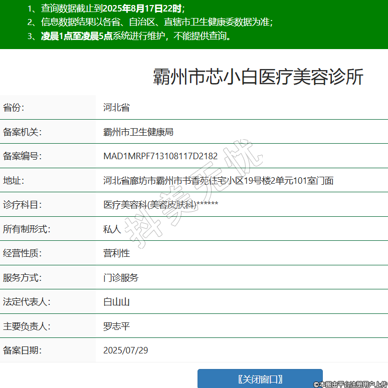 省份:河北省備案機(jī)關(guān):霸州市衛(wèi)生健康局備案編號:MAD1MRPF713108117D2182地址:河北省廊坊市霸州市書香苑住宅小區(qū)19號樓2單元101室門面診療科目:醫(yī)療美容科(美容皮膚科)******所有制形式:私人經(jīng)營性質(zhì):營利性服務(wù)方式:門診服務(wù)法定代表人:白山山主要負(fù)責(zé)人:羅志平備案日期:2025/07/29 -
