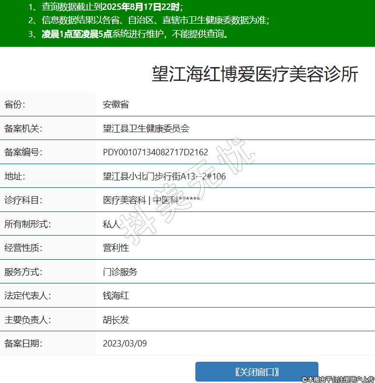 省份:安徽省備案機(jī)關(guān):望江縣衛(wèi)生健康委員會(huì)備案編號(hào):PDY00107134082717D2162地址:望江縣小北門步行街A13--2#106診療科目:醫(yī)療美容科 | 中醫(yī)科******所有制形式:私人經(jīng)營(yíng)性質(zhì):營(yíng)利性服務(wù)方式:門診服務(wù)法定代表人:錢海紅主要負(fù)責(zé)人:胡長(zhǎng)發(fā)備案日期:2023/03/09 -