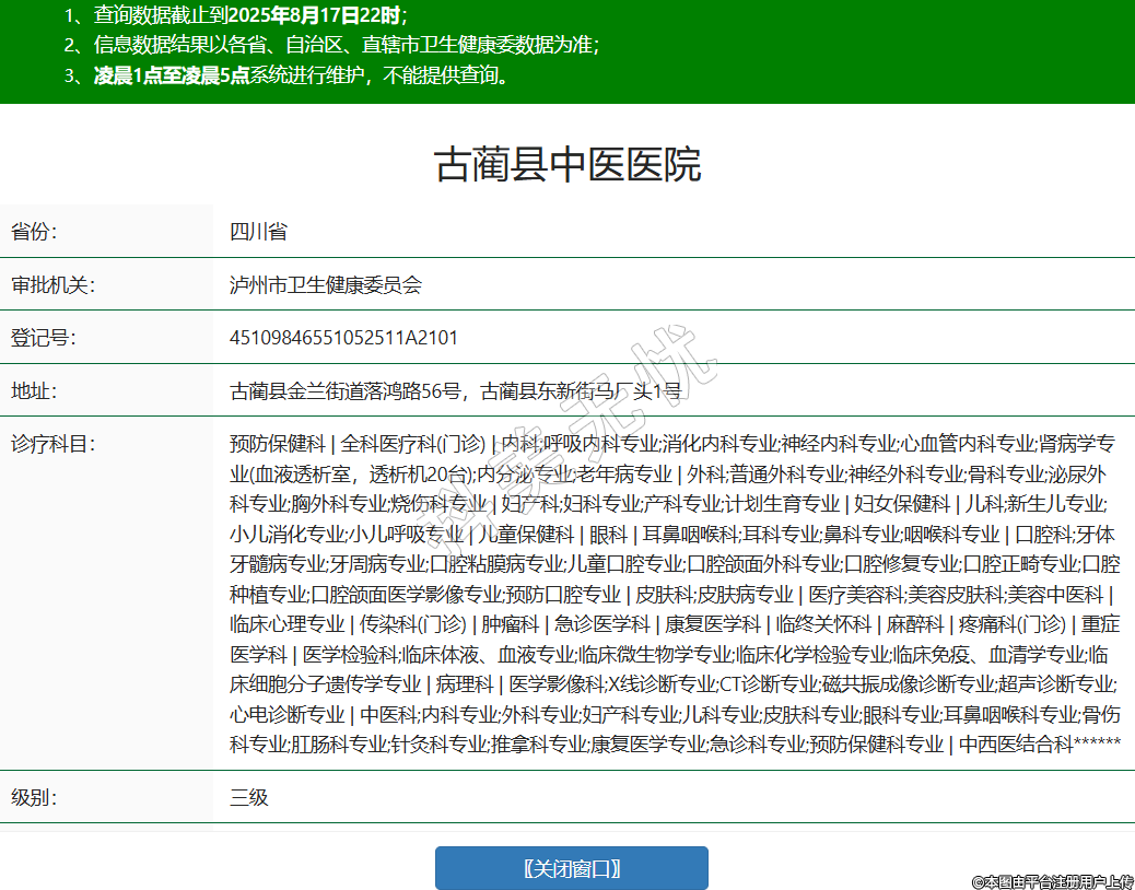 省份:四川省審批機(jī)關(guān):瀘州市衛(wèi)生健康委員會(huì)登記號(hào):45109846551052511A2101地址:古藺縣金蘭街道落鴻路56號(hào),古藺縣東新街馬廠頭1號(hào)診療科目:預(yù)防保健科 | 全科醫(yī)療科(門(mén)診) | 內(nèi)科;呼吸內(nèi)科專(zhuān)業(yè);消化內(nèi)科專(zhuān)業(yè);神經(jīng)內(nèi)科專(zhuān)業(yè);心血管內(nèi)科專(zhuān)業(yè);腎病學(xué)專(zhuān)業(yè)(血液透析室,透析機(jī)20臺(tái));內(nèi)分泌專(zhuān)業(yè);老年病專(zhuān)業(yè) | 外科;普通外科專(zhuān)業(yè);神經(jīng)外科專(zhuān)業(yè);骨科專(zhuān)業(yè);泌尿外科專(zhuān)業(yè);胸外科專(zhuān)業(yè);燒傷科專(zhuān)業(yè) | 婦產(chǎn)科;婦科專(zhuān)業(yè);產(chǎn)科專(zhuān)業(yè);計(jì)劃生育專(zhuān)業(yè) | 婦女保健科 | 兒科;新生兒專(zhuān)業(yè);小兒消化專(zhuān)業(yè);小兒呼吸專(zhuān)業(yè) | 兒童保健科 | 眼科 | 耳鼻咽喉科;耳科專(zhuān)業(yè);鼻科專(zhuān)業(yè);咽喉科專(zhuān)業(yè) | 口腔科;牙體牙髓病專(zhuān)業(yè);牙周病專(zhuān)業(yè);口腔粘膜病專(zhuān)業(yè);兒童口腔專(zhuān)業(yè);口腔頜面外科專(zhuān)業(yè);口腔修復(fù)專(zhuān)業(yè);口腔正畸專(zhuān)業(yè);口腔種植專(zhuān)業(yè);口腔頜面醫(yī)學(xué)影像專(zhuān)業(yè);預(yù)防口腔專(zhuān)業(yè) | 皮膚科;皮膚病專(zhuān)業(yè) | 醫(yī)療美容科;美容皮膚科;美容中醫(yī)科 | 臨床心理專(zhuān)業(yè) | 傳染科(門(mén)診) | 腫瘤科 | 急診醫(yī)學(xué)科 | 康復(fù)醫(yī)學(xué)科 | 臨終關(guān)懷科 | 麻醉科 | 疼痛科(門(mén)診) | 重癥醫(yī)學(xué)科 | 醫(yī)學(xué)檢驗(yàn)科;臨床體液、血液專(zhuān)業(yè);臨床微生物學(xué)專(zhuān)業(yè);臨床化學(xué)檢驗(yàn)專(zhuān)業(yè);臨床免疫、血清學(xué)專(zhuān)業(yè);臨床細(xì)胞分子遺傳學(xué)專(zhuān)業(yè) | 病理科 | 醫(yī)學(xué)影像科;X線診斷專(zhuān)業(yè);CT診斷專(zhuān)業(yè);磁共振成像診斷專(zhuān)業(yè);超聲診斷專(zhuān)業(yè);心電診斷專(zhuān)業(yè) | 中醫(yī)科;內(nèi)科專(zhuān)業(yè);外科專(zhuān)業(yè);婦產(chǎn)科專(zhuān)業(yè);兒科專(zhuān)業(yè);皮膚科專(zhuān)業(yè);眼科專(zhuān)業(yè);耳鼻咽喉科專(zhuān)業(yè);骨傷科專(zhuān)業(yè);肛腸科專(zhuān)業(yè);針灸科專(zhuān)業(yè);推拿科專(zhuān)業(yè);康復(fù)醫(yī)學(xué)專(zhuān)業(yè);急診科專(zhuān)業(yè);預(yù)防保健科專(zhuān)業(yè) | 中西醫(yī)結(jié)合科******級(jí)別:三級(jí)法定代表人:王澤琛主要負(fù)責(zé)人:王澤琛執(zhí)業(yè)許可證有效期:2022/11/23 -至- 2030/12/31 -