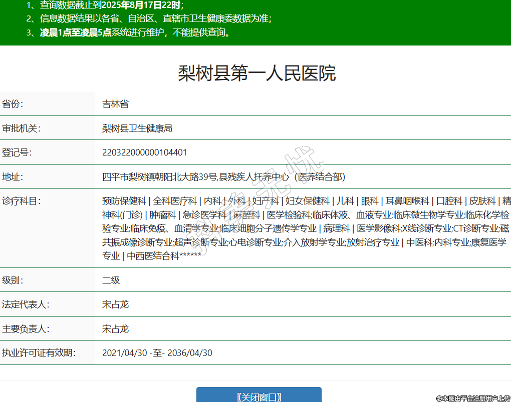 省份:吉林省審批機關:梨樹縣衛(wèi)生健康局登記號:220322000000104401地址:四平市梨樹鎮(zhèn)朝陽北大路39號,縣殘疾人托養(yǎng)中心(醫(yī)養(yǎng)結合部)診療科目:預防保健科 | 全科醫(yī)療科 | 內(nèi)科 | 外科 | 婦產(chǎn)科 | 婦女保健科 | 兒科 | 眼科 | 耳鼻咽喉科 | 口腔科 | 皮膚科 | 精神科(門診) | 腫瘤科 | 急診醫(yī)學科 | 麻醉科 | 醫(yī)學檢驗科;臨床體液、血液專業(yè);臨床微生物學專業(yè);臨床化學檢驗專業(yè);臨床免疫、血清學專業(yè);臨床細胞分子遺傳學專業(yè) | 病理科 | 醫(yī)學影像科;X線診斷專業(yè);CT診斷專業(yè);磁共振成像診斷專業(yè);超聲診斷專業(yè);心電診斷專業(yè);介入放射學專業(yè);放射治療專業(yè) | 中醫(yī)科;內(nèi)科專業(yè);康復醫(yī)學專業(yè) | 中西醫(yī)結合科******級別:二級法定代表人:宋占龍主要負責人:宋占龍執(zhí)業(yè)許可證有效期:2021/04/30 -至- 2036/04/30 -