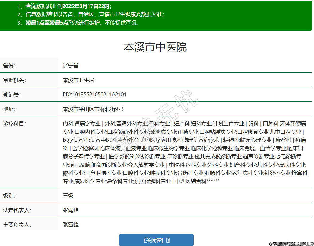 省份:遼寧省審批機關(guān):本溪市衛(wèi)生局登記號:PDY10135521050211A2101地址:本溪市平山區(qū)市府北街9號診療科目:內(nèi)科;腎病學(xué)專業(yè) | 外科;普通外科專業(yè);骨科專業(yè) | 婦產(chǎn)科;婦科專業(yè);計劃生育專業(yè) | 眼科 | 口腔科;牙體牙髓病專業(yè);口腔內(nèi)科專業(yè);口腔頜面外科專業(yè);牙周病專業(yè);正畸專業(yè);口腔粘膜病專業(yè);口腔修復(fù)專業(yè);兒童口腔專業(yè) | 醫(yī)療美容科;美容中醫(yī)科;中藥外治;美容醫(yī)療應(yīng)用技術(shù);物理美容治療術(shù) | 精神科;臨床心理專業(yè) | 麻醉科 | 疼痛科 | 醫(yī)學(xué)檢驗科;臨床體液、血液專業(yè);臨床微生物學(xué)專業(yè);臨床化學(xué)檢驗專業(yè);臨床免疫、血清學(xué)專業(yè);臨床細胞分子遺傳學(xué)專業(yè) | 醫(yī)學(xué)影像科;X線診斷專業(yè);CT診斷專業(yè);磁共振成像診斷專業(yè);超聲診斷專業(yè);心電診斷專業(yè);腦電及腦血流圖診斷專業(yè);介入放射學(xué)專業(yè) | 中醫(yī)科;內(nèi)科專業(yè);外科專業(yè);婦產(chǎn)科專業(yè);兒科專業(yè);皮膚科專業(yè);眼科專業(yè);耳鼻咽喉科專業(yè);口腔科專業(yè);腫瘤科專業(yè);骨傷科專業(yè);肛腸科專業(yè);老年病科專業(yè);針灸科專業(yè);推拿科專業(yè);康復(fù)醫(yī)學(xué)專業(yè);急診科專業(yè);預(yù)防保健科專業(yè) | 中西醫(yī)結(jié)合科******級別:三級法定代表人:張霄峰主要負(fù)責(zé)人:張霄峰執(zhí)業(yè)許可證有效期:2012/03/30 -至- 2027/03/30 -