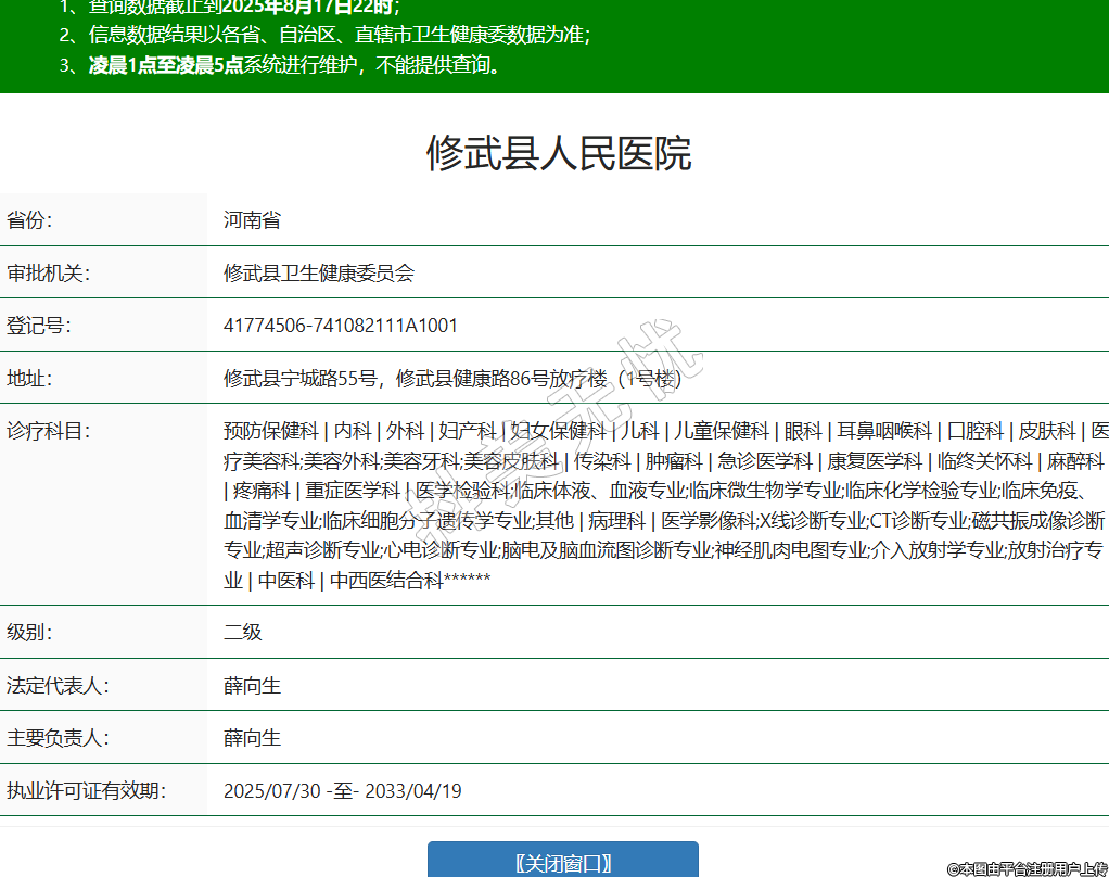 省份:河南省審批機關(guān):修武縣衛(wèi)生健康委員會登記號:41774506-741082111A1001地址:修武縣寧城路55號,修武縣健康路86號放療樓(1號樓)診療科目:預(yù)防保健科 | 內(nèi)科 | 外科 | 婦產(chǎn)科 | 婦女保健科 | 兒科 | 兒童保健科 | 眼科 | 耳鼻咽喉科 | 口腔科 | 皮膚科 | 醫(yī)療美容科;美容外科;美容牙科;美容皮膚科 | 傳染科 | 腫瘤科 | 急診醫(yī)學(xué)科 | 康復(fù)醫(yī)學(xué)科 | 臨終關(guān)懷科 | 麻醉科 | 疼痛科 | 重癥醫(yī)學(xué)科 | 醫(yī)學(xué)檢驗科;臨床體液、血液專業(yè);臨床微生物學(xué)專業(yè);臨床化學(xué)檢驗專業(yè);臨床免疫、血清學(xué)專業(yè);臨床細胞分子遺傳學(xué)專業(yè);其他 | 病理科 | 醫(yī)學(xué)影像科;X線診斷專業(yè);CT診斷專業(yè);磁共振成像診斷專業(yè);超聲診斷專業(yè);心電診斷專業(yè);腦電及腦血流圖診斷專業(yè);神經(jīng)肌肉電圖專業(yè);介入放射學(xué)專業(yè);放射治療專業(yè) | 中醫(yī)科 | 中西醫(yī)結(jié)合科******級別:二級法定代表人:薛向生主要負責(zé)人:薛向生執(zhí)業(yè)許可證有效期:2025/07/30 -至- 2033/04/19 -