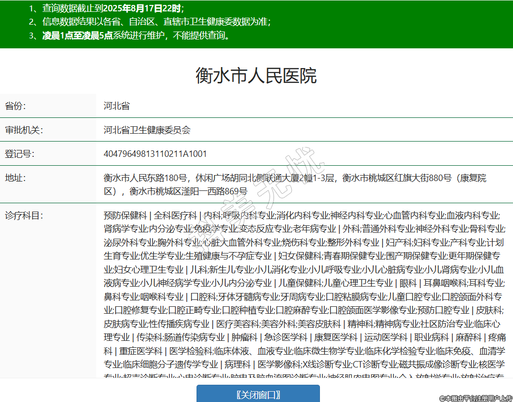 省份:河北省審批機關(guān):河北省衛(wèi)生健康委員會登記號:40479649813110211A1001地址:衡水市人民東路180號,休閑廣場胡同北側(cè)聯(lián)通大廈2幢1-3層,衡水市桃城區(qū)紅旗大街880號(康復(fù)院區(qū)),衡水市桃城區(qū)滏陽一西路869號診療科目:預(yù)防保健科 | 全科醫(yī)療科 | 內(nèi)科;呼吸內(nèi)科專業(yè);消化內(nèi)科專業(yè);神經(jīng)內(nèi)科專業(yè);心血管內(nèi)科專業(yè);血液內(nèi)科專業(yè);腎病學(xué)專業(yè);內(nèi)分泌專業(yè);免疫學(xué)專業(yè);變態(tài)反應(yīng)專業(yè);老年病專業(yè) | 外科;普通外科專業(yè);神經(jīng)外科專業(yè);骨科專業(yè);泌尿外科專業(yè);胸外科專業(yè);心臟大血管外科專業(yè);燒傷科專業(yè);整形外科專業(yè) | 婦產(chǎn)科;婦科專業(yè);產(chǎn)科專業(yè);計劃生育專業(yè);優(yōu)生學(xué)專業(yè);生殖健康與不孕癥專業(yè) | 婦女保健科;青春期保健專業(yè);圍產(chǎn)期保健專業(yè);更年期保健專業(yè);婦女心理衛(wèi)生專業(yè) | 兒科;新生兒專業(yè);小兒消化專業(yè);小兒呼吸專業(yè);小兒心臟病專業(yè);小兒腎病專業(yè);小兒血液病專業(yè);小兒神經(jīng)病學(xué)專業(yè);小兒內(nèi)分泌專業(yè) | 兒童保健科;兒童心理衛(wèi)生專業(yè) | 眼科 | 耳鼻咽喉科;耳科專業(yè);鼻科專業(yè);咽喉科專業(yè) | 口腔科;牙體牙髓病專業(yè);牙周病專業(yè);口腔粘膜病專業(yè);兒童口腔專業(yè);口腔頜面外科專業(yè);口腔修復(fù)專業(yè);口腔正畸專業(yè);口腔種植專業(yè);口腔麻醉專業(yè);口腔頜面醫(yī)學(xué)影像專業(yè);預(yù)防口腔專業(yè) | 皮膚科;皮膚病專業(yè);性傳播疾病專業(yè) | 醫(yī)療美容科;美容外科;美容皮膚科 | 精神科;精神病專業(yè);社區(qū)防治專業(yè);臨床心理專業(yè) | 傳染科;腸道傳染病專業(yè) | 腫瘤科 | 急診醫(yī)學(xué)科 | 康復(fù)醫(yī)學(xué)科 | 運動醫(yī)學(xué)科 | 職業(yè)病科 | 麻醉科 | 疼痛科 | 重癥醫(yī)學(xué)科 | 醫(yī)學(xué)檢驗科;臨床體液、血液專業(yè);臨床微生物學(xué)專業(yè);臨床化學(xué)檢驗專業(yè);臨床免疫、血清學(xué)專業(yè);臨床細(xì)胞分子遺傳學(xué)專業(yè) | 病理科 | 醫(yī)學(xué)影像科;X線診斷專業(yè);CT診斷專業(yè);磁共振成像診斷專業(yè);核醫(yī)學(xué)專業(yè);超聲診斷專業(yè);心電診斷專業(yè);腦電及腦血流圖診斷專業(yè);神經(jīng)肌肉電圖專業(yè);介入放射學(xué)專業(yè);放射治療專業(yè) | 中醫(yī)科;內(nèi)科專業(yè);婦產(chǎn)科專業(yè);兒科專業(yè);皮膚科專業(yè);針灸科專業(yè);推拿科專業(yè);康復(fù)醫(yī)學(xué)專業(yè);預(yù)防保健科專業(yè)******級別:三級法定代表人:曹雙清主要負(fù)責(zé)人:執(zhí)業(yè)許可證有效期:2025/05/26 -至- 2029/10/26 -