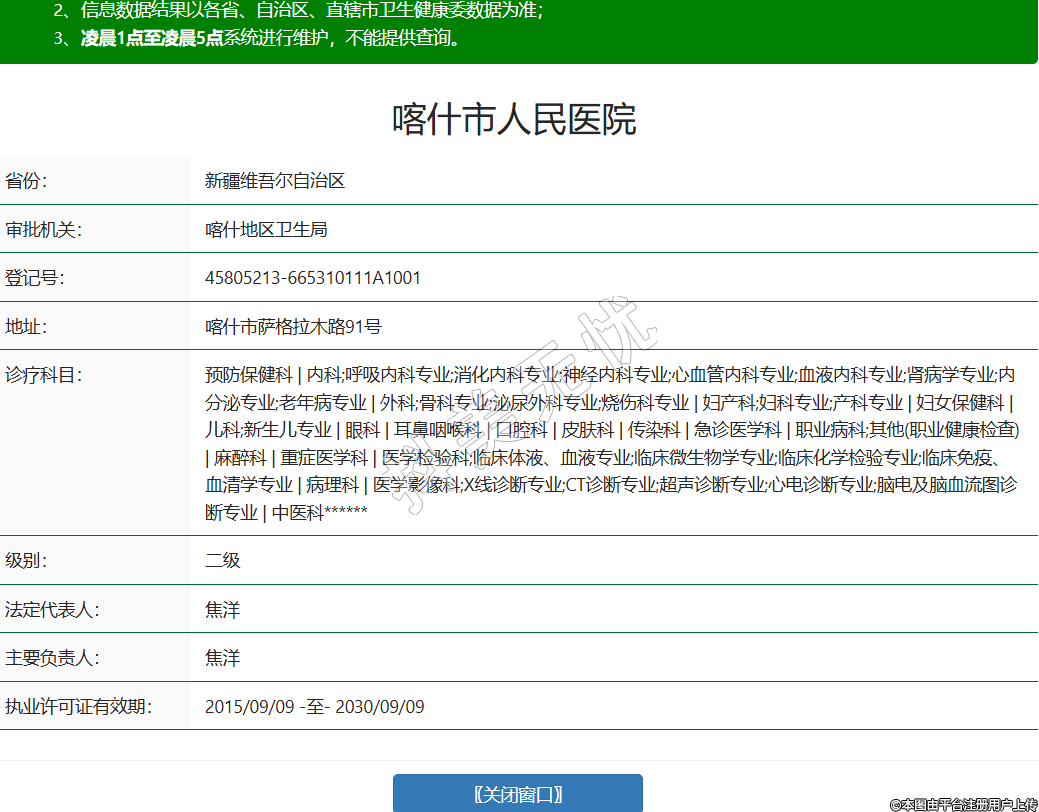省份:新疆維吾爾自治區(qū)審批機(jī)關(guān):喀什地區(qū)衛(wèi)生局登記號(hào):45805213-665310111A1001地址:喀什市薩格拉木路91號(hào)診療科目:預(yù)防保健科 | 內(nèi)科;呼吸內(nèi)科專業(yè);消化內(nèi)科專業(yè);神經(jīng)內(nèi)科專業(yè);心血管內(nèi)科專業(yè);血液內(nèi)科專業(yè);腎病學(xué)專業(yè);內(nèi)分泌專業(yè);老年病專業(yè) | 外科;骨科專業(yè);泌尿外科專業(yè);燒傷科專業(yè) | 婦產(chǎn)科;婦科專業(yè);產(chǎn)科專業(yè) | 婦女保健科 | 兒科;新生兒專業(yè) | 眼科 | 耳鼻咽喉科 | 口腔科 | 皮膚科 | 傳染科 | 急診醫(yī)學(xué)科 | 職業(yè)病科;其他(職業(yè)健康檢查) | 麻醉科 | 重癥醫(yī)學(xué)科 | 醫(yī)學(xué)檢驗(yàn)科;臨床體液、血液專業(yè);臨床微生物學(xué)專業(yè);臨床化學(xué)檢驗(yàn)專業(yè);臨床免疫、血清學(xué)專業(yè) | 病理科 | 醫(yī)學(xué)影像科;X線診斷專業(yè);CT診斷專業(yè);超聲診斷專業(yè);心電診斷專業(yè);腦電及腦血流圖診斷專業(yè) | 中醫(yī)科******級(jí)別:二級(jí)法定代表人:焦洋主要負(fù)責(zé)人:焦洋執(zhí)業(yè)許可證有效期:2015/09/09 -至- 2030/09/09 -