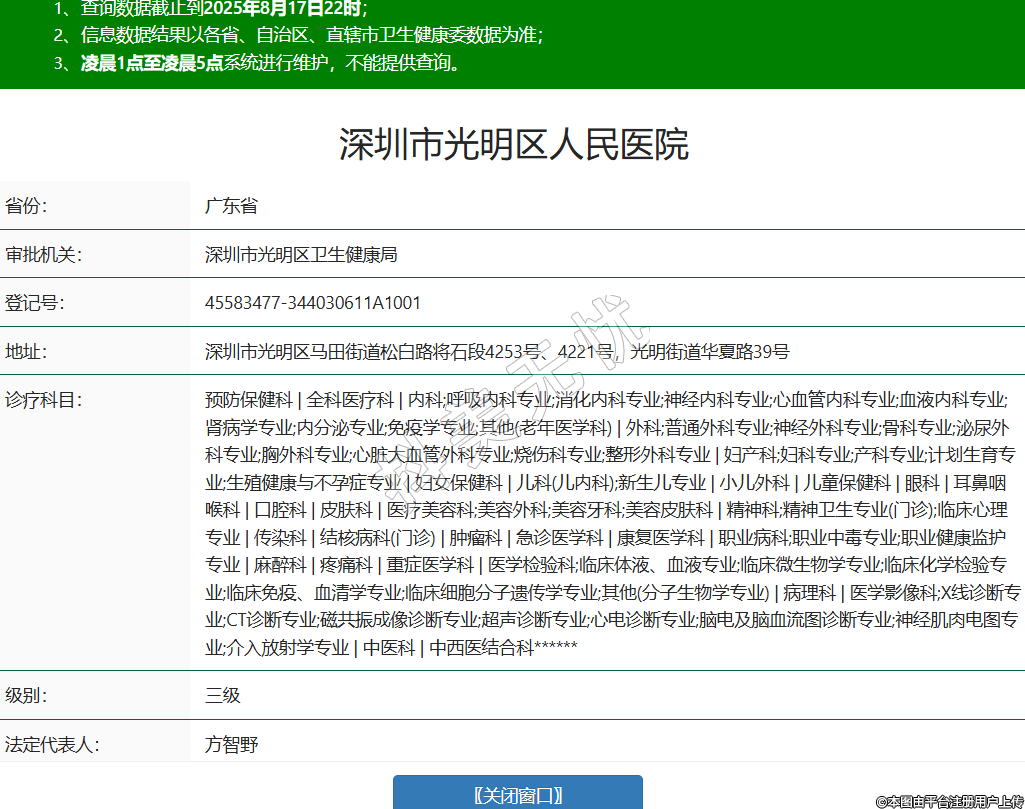 省份:廣東省審批機關(guān):深圳市光明區(qū)衛(wèi)生健康局登記號:45583477-344030611A1001地址:深圳市光明區(qū)馬田街道松白路將石段4253號、4221號,光明街道華夏路39號診療科目:預(yù)防保健科 | 全科醫(yī)療科 | 內(nèi)科;呼吸內(nèi)科專業(yè);消化內(nèi)科專業(yè);神經(jīng)內(nèi)科專業(yè);心血管內(nèi)科專業(yè);血液內(nèi)科專業(yè);腎病學(xué)專業(yè);內(nèi)分泌專業(yè);免疫學(xué)專業(yè);其他(老年醫(yī)學(xué)科) | 外科;普通外科專業(yè);神經(jīng)外科專業(yè);骨科專業(yè);泌尿外科專業(yè);胸外科專業(yè);心臟大血管外科專業(yè);燒傷科專業(yè);整形外科專業(yè) | 婦產(chǎn)科;婦科專業(yè);產(chǎn)科專業(yè);計劃生育專業(yè);生殖健康與不孕癥專業(yè) | 婦女保健科 | 兒科(兒內(nèi)科);新生兒專業(yè) | 小兒外科 | 兒童保健科 | 眼科 | 耳鼻咽喉科 | 口腔科 | 皮膚科 | 醫(yī)療美容科;美容外科;美容牙科;美容皮膚科 | 精神科;精神衛(wèi)生專業(yè)(門診);臨床心理專業(yè) | 傳染科 | 結(jié)核病科(門診) | 腫瘤科 | 急診醫(yī)學(xué)科 | 康復(fù)醫(yī)學(xué)科 | 職業(yè)病科;職業(yè)中毒專業(yè);職業(yè)健康監(jiān)護專業(yè) | 麻醉科 | 疼痛科 | 重癥醫(yī)學(xué)科 | 醫(yī)學(xué)檢驗科;臨床體液、血液專業(yè);臨床微生物學(xué)專業(yè);臨床化學(xué)檢驗專業(yè);臨床免疫、血清學(xué)專業(yè);臨床細胞分子遺傳學(xué)專業(yè);其他(分子生物學(xué)專業(yè)) | 病理科 | 醫(yī)學(xué)影像科;X線診斷專業(yè);CT診斷專業(yè);磁共振成像診斷專業(yè);超聲診斷專業(yè);心電診斷專業(yè);腦電及腦血流圖診斷專業(yè);神經(jīng)肌肉電圖專業(yè);介入放射學(xué)專業(yè) | 中醫(yī)科 | 中西醫(yī)結(jié)合科******級別:三級法定代表人:方智野主要負責(zé)人:***執(zhí)業(yè)許可證有效期:2021/09/10 -至- 2036/09/09 -