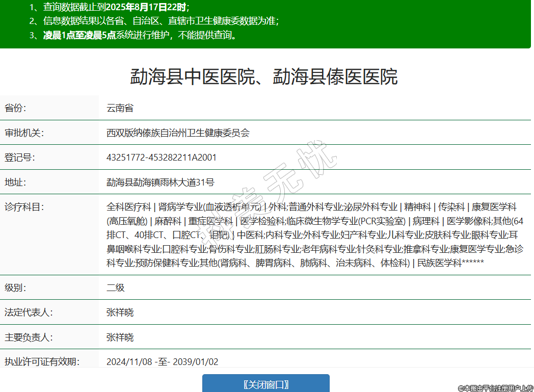 省份:云南省審批機(jī)關(guān):西雙版納傣族自治州衛(wèi)生健康委員會登記號:43251772-453282211A2001地址:勐??h勐海鎮(zhèn)雨林大道31號診療科目:全科醫(yī)療科 | 腎病學(xué)專業(yè)(血液透析單元) | 外科;普通外科專業(yè);泌尿外科專業(yè) | 精神科 | 傳染科 | 康復(fù)醫(yī)學(xué)科(高壓氧艙) | 麻醉科 | 重癥醫(yī)學(xué)科 | 醫(yī)學(xué)檢驗(yàn)科;臨床微生物學(xué)專業(yè)(PCR實(shí)驗(yàn)室) | 病理科 | 醫(yī)學(xué)影像科;其他(64排CT、40排CT、口腔CT、鉬靶) | 中醫(yī)科;內(nèi)科專業(yè);外科專業(yè);婦產(chǎn)科專業(yè);兒科專業(yè);皮膚科專業(yè);眼科專業(yè);耳鼻咽喉科專業(yè);口腔科專業(yè);骨傷科專業(yè);肛腸科專業(yè);老年病科專業(yè);針灸科專業(yè);推拿科專業(yè);康復(fù)醫(yī)學(xué)專業(yè);急診科專業(yè);預(yù)防保健科專業(yè);其他(腎病科、脾胃病科、肺病科、治未病科、體檢科) | 民族醫(yī)學(xué)科******級別:二級法定代表人:張祥曉主要負(fù)責(zé)人:張祥曉執(zhí)業(yè)許可證有效期:2024/11/08 -至- 2039/01/02 -