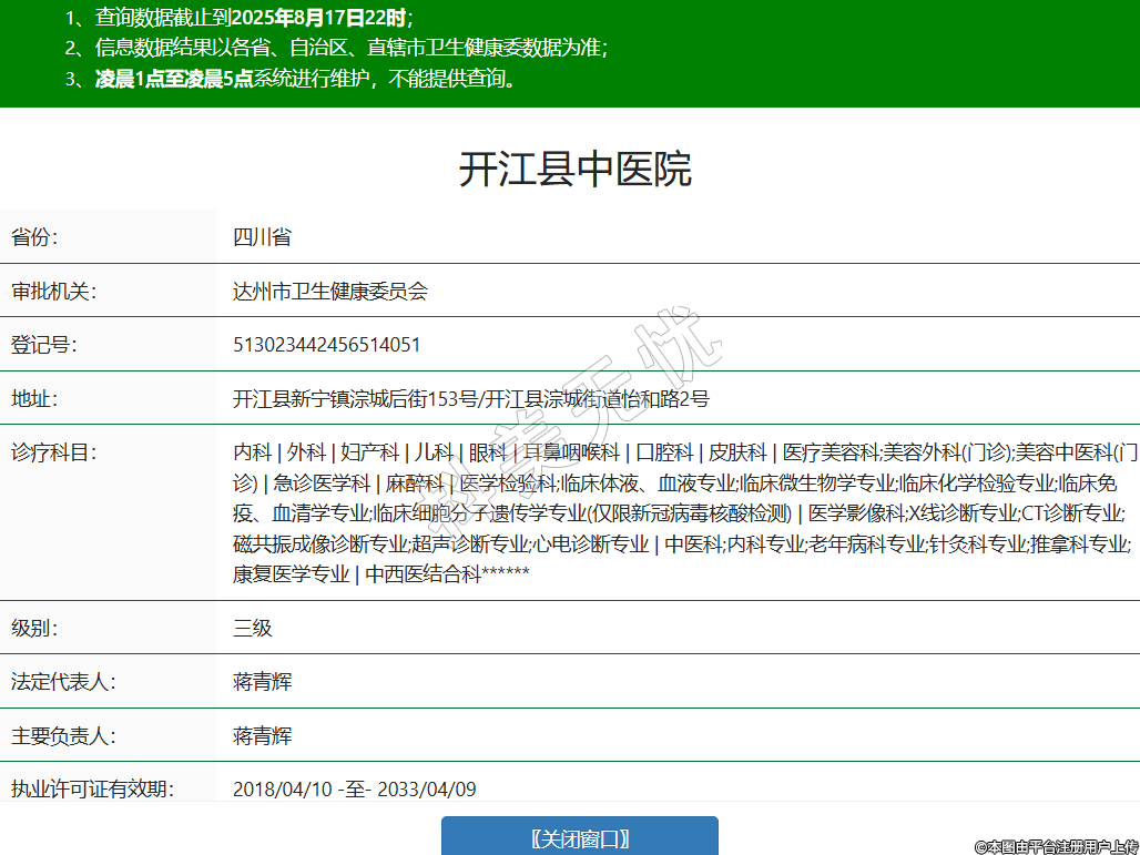 省份:四川省審批機(jī)關(guān):達(dá)州市衛(wèi)生健康委員會登記號:513023442456514051地址:開江縣新寧鎮(zhèn)淙城后街153號/開江縣淙城街道怡和路2號診療科目:內(nèi)科 | 外科 | 婦產(chǎn)科 | 兒科 | 眼科 | 耳鼻咽喉科 | 口腔科 | 皮膚科 | 醫(yī)療美容科;美容外科(門診);美容中醫(yī)科(門診) | 急診醫(yī)學(xué)科 | 麻醉科 | 醫(yī)學(xué)檢驗科;臨床體液、血液專業(yè);臨床微生物學(xué)專業(yè);臨床化學(xué)檢驗專業(yè);臨床免疫、血清學(xué)專業(yè);臨床細(xì)胞分子遺傳學(xué)專業(yè)(僅限新冠病毒核酸檢測) | 醫(yī)學(xué)影像科;X線診斷專業(yè);CT診斷專業(yè);磁共振成像診斷專業(yè);超聲診斷專業(yè);心電診斷專業(yè) | 中醫(yī)科;內(nèi)科專業(yè);老年病科專業(yè);針灸科專業(yè);推拿科專業(yè);康復(fù)醫(yī)學(xué)專業(yè) | 中西醫(yī)結(jié)合科******級別:三級法定代表人:蔣青輝主要負(fù)責(zé)人:蔣青輝執(zhí)業(yè)許可證有效期:2018/04/10 -至- 2033/04/09 -