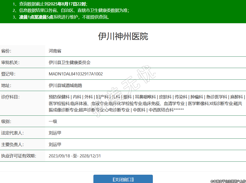 省份:河南省審批機(jī)關(guān):伊川縣衛(wèi)生健康委員會(huì)登記號(hào):MADN1DAL841032917A1002地址:伊川縣城酒城南路診療科目:預(yù)防保健科 | 內(nèi)科 | 外科 | 婦產(chǎn)科 | 兒科 | 眼科 | 耳鼻咽喉科 | 皮膚科 | 傳染科 | 腫瘤科 | 急診醫(yī)學(xué)科 | 麻醉科 | 醫(yī)學(xué)檢驗(yàn)科;臨床體液、血液專業(yè);臨床化學(xué)檢驗(yàn)專業(yè);臨床免疫、血清學(xué)專業(yè) | 醫(yī)學(xué)影像科;X線診斷專業(yè);磁共振成像診斷專業(yè);超聲診斷專業(yè);心電診斷專業(yè) | 中醫(yī)科 | 中西醫(yī)結(jié)合科******級(jí)別:一級(jí)法定代表人:劉運(yùn)甲主要負(fù)責(zé)人:劉運(yùn)甲執(zhí)業(yè)許可證有效期:2023/09/18 -至- 2028/12/31 -