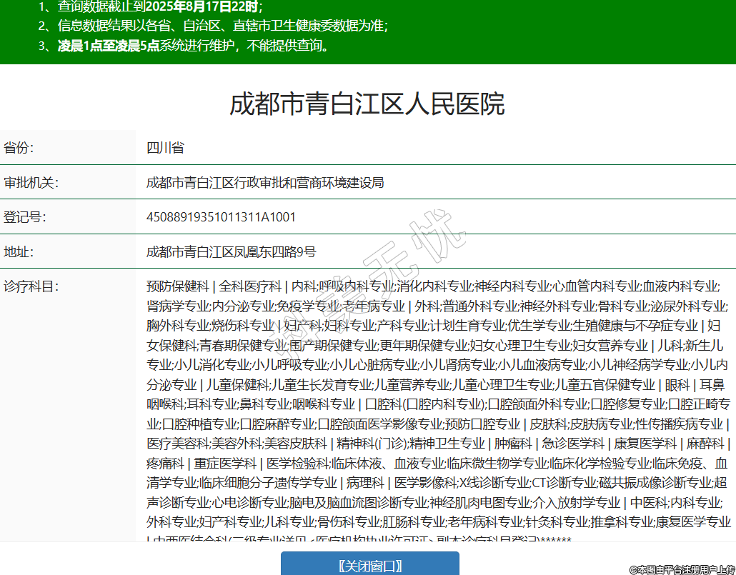 省份:四川省審批機關(guān):成都市青白江區(qū)行政審批和營商環(huán)境建設(shè)局登記號:45088919351011311A1001地址:成都市青白江區(qū)鳳凰東四路9號診療科目:預(yù)防保健科 | 全科醫(yī)療科 | 內(nèi)科;呼吸內(nèi)科專業(yè);消化內(nèi)科專業(yè);神經(jīng)內(nèi)科專業(yè);心血管內(nèi)科專業(yè);血液內(nèi)科專業(yè);腎病學(xué)專業(yè);內(nèi)分泌專業(yè);免疫學(xué)專業(yè);老年病專業(yè) | 外科;普通外科專業(yè);神經(jīng)外科專業(yè);骨科專業(yè);泌尿外科專業(yè);胸外科專業(yè);燒傷科專業(yè) | 婦產(chǎn)科;婦科專業(yè);產(chǎn)科專業(yè);計劃生育專業(yè);優(yōu)生學(xué)專業(yè);生殖健康與不孕癥專業(yè) | 婦女保健科;青春期保健專業(yè);圍產(chǎn)期保健專業(yè);更年期保健專業(yè);婦女心理衛(wèi)生專業(yè);婦女營養(yǎng)專業(yè) | 兒科;新生兒專業(yè);小兒消化專業(yè);小兒呼吸專業(yè);小兒心臟病專業(yè);小兒腎病專業(yè);小兒血液病專業(yè);小兒神經(jīng)病學(xué)專業(yè);小兒內(nèi)分泌專業(yè) | 兒童保健科;兒童生長發(fā)育專業(yè);兒童營養(yǎng)專業(yè);兒童心理衛(wèi)生專業(yè);兒童五官保健專業(yè) | 眼科 | 耳鼻咽喉科;耳科專業(yè);鼻科專業(yè);咽喉科專業(yè) | 口腔科(口腔內(nèi)科專業(yè));口腔頜面外科專業(yè);口腔修復(fù)專業(yè);口腔正畸專業(yè);口腔種植專業(yè);口腔麻醉專業(yè);口腔頜面醫(yī)學(xué)影像專業(yè);預(yù)防口腔專業(yè) | 皮膚科;皮膚病專業(yè);性傳播疾病專業(yè) | 醫(yī)療美容科;美容外科;美容皮膚科 | 精神科(門診);精神衛(wèi)生專業(yè) | 腫瘤科 | 急診醫(yī)學(xué)科 | 康復(fù)醫(yī)學(xué)科 | 麻醉科 | 疼痛科 | 重癥醫(yī)學(xué)科 | 醫(yī)學(xué)檢驗科;臨床體液、血液專業(yè);臨床微生物學(xué)專業(yè);臨床化學(xué)檢驗專業(yè);臨床免疫、血清學(xué)專業(yè);臨床細胞分子遺傳學(xué)專業(yè) | 病理科 | 醫(yī)學(xué)影像科;X線診斷專業(yè);CT診斷專業(yè);磁共振成像診斷專業(yè);超聲診斷專業(yè);心電診斷專業(yè);腦電及腦血流圖診斷專業(yè);神經(jīng)肌肉電圖專業(yè);介入放射學(xué)專業(yè) | 中醫(yī)科;內(nèi)科專業(yè);外科專業(yè);婦產(chǎn)科專業(yè);兒科專業(yè);骨傷科專業(yè);肛腸科專業(yè);老年病科專業(yè);針灸科專業(yè);推拿科專業(yè);康復(fù)醫(yī)學(xué)專業(yè) | 中西醫(yī)結(jié)合科(二級專業(yè)詳見<醫(yī)療機構(gòu)執(zhí)業(yè)許可證>副本診療科目登記)******級別:三級法定代表人:張文勇主要負責人:執(zhí)業(yè)許可證有效期:2013/12/13 -至- 2028/12/12 -