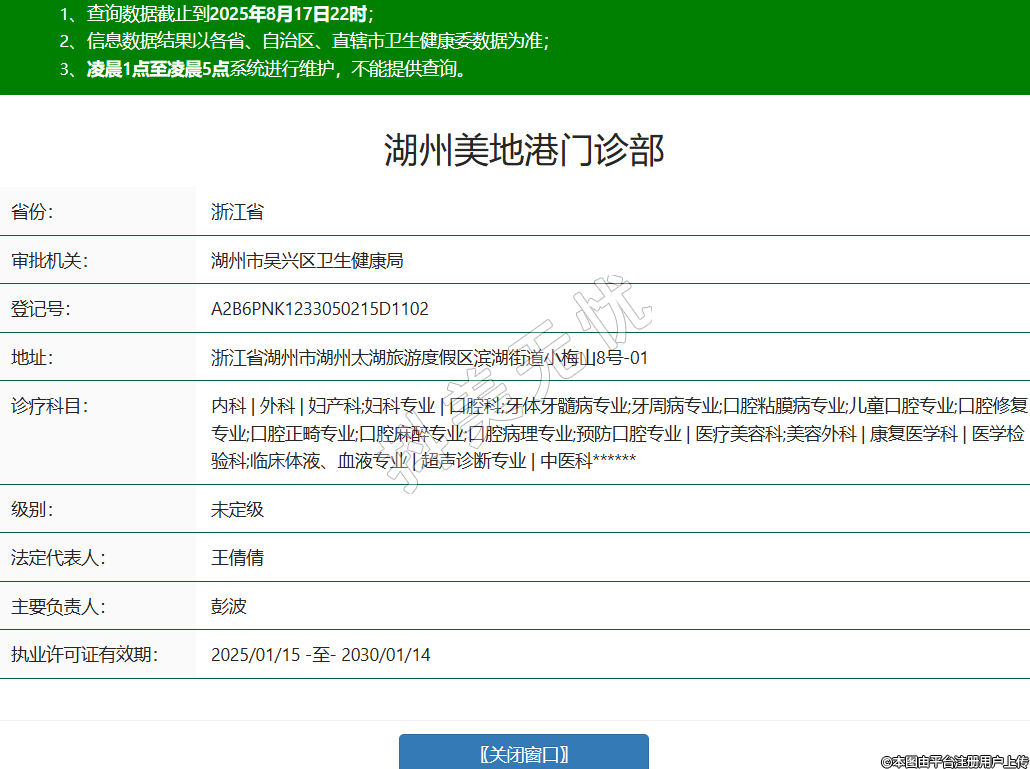 省份:浙江省審批機關:湖州市吳興區(qū)衛(wèi)生健康局登記號:A2B6PNK1233050215D1102地址:浙江省湖州市湖州太湖旅游度假區(qū)濱湖街道小梅山8號-01診療科目:內科 | 外科 | 婦產科;婦科專業(yè) | 口腔科;牙體牙髓病專業(yè);牙周病專業(yè);口腔粘膜病專業(yè);兒童口腔專業(yè);口腔修復專業(yè);口腔正畸專業(yè);口腔麻醉專業(yè);口腔病理專業(yè);預防口腔專業(yè) | 醫(yī)療美容科;美容外科 | 康復醫(yī)學科 | 醫(yī)學檢驗科;臨床體液、血液專業(yè) | 超聲診斷專業(yè) | 中醫(yī)科******級別:未定級法定代表人:王倩倩主要負責人:彭波執(zhí)業(yè)許可證有效期:2025/01/15 -至- 2030/01/14 -