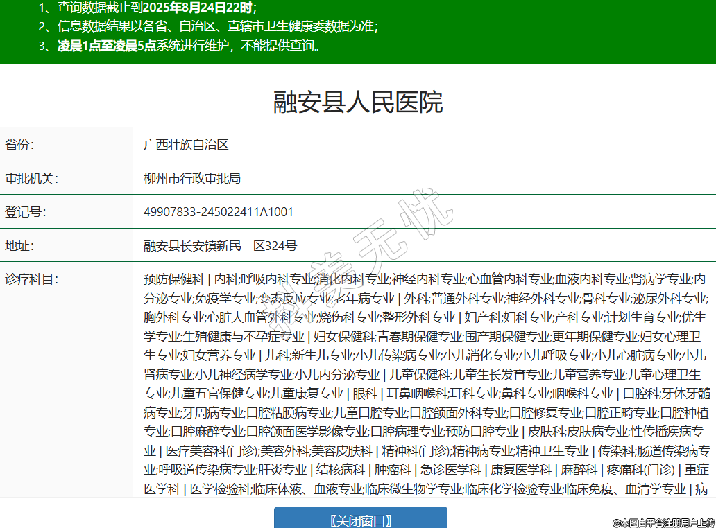 省份:廣西壯族自治區(qū)審批機(jī)關(guān):柳州市行政審批局登記號(hào):49907833-245022411A1001地址:融安縣長(zhǎng)安鎮(zhèn)新民一區(qū)324號(hào)診療科目:預(yù)防保健科 | 內(nèi)科;呼吸內(nèi)科專業(yè);消化內(nèi)科專業(yè);神經(jīng)內(nèi)科專業(yè);心血管內(nèi)科專業(yè);血液內(nèi)科專業(yè);腎病學(xué)專業(yè);內(nèi)分泌專業(yè);免疫學(xué)專業(yè);變態(tài)反應(yīng)專業(yè);老年病專業(yè) | 外科;普通外科專業(yè);神經(jīng)外科專業(yè);骨科專業(yè);泌尿外科專業(yè);胸外科專業(yè);心臟大血管外科專業(yè);燒傷科專業(yè);整形外科專業(yè) | 婦產(chǎn)科;婦科專業(yè);產(chǎn)科專業(yè);計(jì)劃生育專業(yè);優(yōu)生學(xué)專業(yè);生殖健康與不孕癥專業(yè) | 婦女保健科;青春期保健專業(yè);圍產(chǎn)期保健專業(yè);更年期保健專業(yè);婦女心理衛(wèi)生專業(yè);婦女營(yíng)養(yǎng)專業(yè) | 兒科;新生兒專業(yè);小兒傳染病專業(yè);小兒消化專業(yè);小兒呼吸專業(yè);小兒心臟病專業(yè);小兒腎病專業(yè);小兒神經(jīng)病學(xué)專業(yè);小兒內(nèi)分泌專業(yè) | 兒童保健科;兒童生長(zhǎng)發(fā)育專業(yè);兒童營(yíng)養(yǎng)專業(yè);兒童心理衛(wèi)生專業(yè);兒童五官保健專業(yè);兒童康復(fù)專業(yè) | 眼科 | 耳鼻咽喉科;耳科專業(yè);鼻科專業(yè);咽喉科專業(yè) | 口腔科;牙體牙髓病專業(yè);牙周病專業(yè);口腔粘膜病專業(yè);兒童口腔專業(yè);口腔頜面外科專業(yè);口腔修復(fù)專業(yè);口腔正畸專業(yè);口腔種植專業(yè);口腔麻醉專業(yè);口腔頜面醫(yī)學(xué)影像專業(yè);口腔病理專業(yè);預(yù)防口腔專業(yè) | 皮膚科;皮膚病專業(yè);性傳播疾病專業(yè) | 醫(yī)療美容科(門診);美容外科;美容皮膚科 | 精神科(門診);精神病專業(yè);精神衛(wèi)生專業(yè) | 傳染科;腸道傳染病專業(yè);呼吸道傳染病專業(yè);肝炎專業(yè) | 結(jié)核病科 | 腫瘤科 | 急診醫(yī)學(xué)科 | 康復(fù)醫(yī)學(xué)科 | 麻醉科 | 疼痛科(門診) | 重癥醫(yī)學(xué)科 | 醫(yī)學(xué)檢驗(yàn)科;臨床體液、血液專業(yè);臨床微生物學(xué)專業(yè);臨床化學(xué)檢驗(yàn)專業(yè);臨床免疫、血清學(xué)專業(yè) | 病理科 | 醫(yī)學(xué)影像科;X線診斷專業(yè);CT診斷專業(yè);磁共振成像診斷專業(yè);超聲診斷專業(yè);心電診斷專業(yè);腦電及腦血流圖診斷專業(yè);介入放射學(xué)專業(yè) | 中醫(yī)科;內(nèi)科專業(yè);外科專業(yè);婦產(chǎn)科專業(yè);兒科專業(yè);骨傷科專業(yè);肛腸科專業(yè);老年病科專業(yè);針灸科專業(yè);推拿科專業(yè);康復(fù)醫(yī)學(xué)專業(yè) | 中西醫(yī)結(jié)合科******級(jí)別:二級(jí)法定代表人:劉朝暉主要負(fù)責(zé)人:劉朝暉執(zhí)業(yè)許可證有效期:2025/07/28 -至- 2033/07/31 -