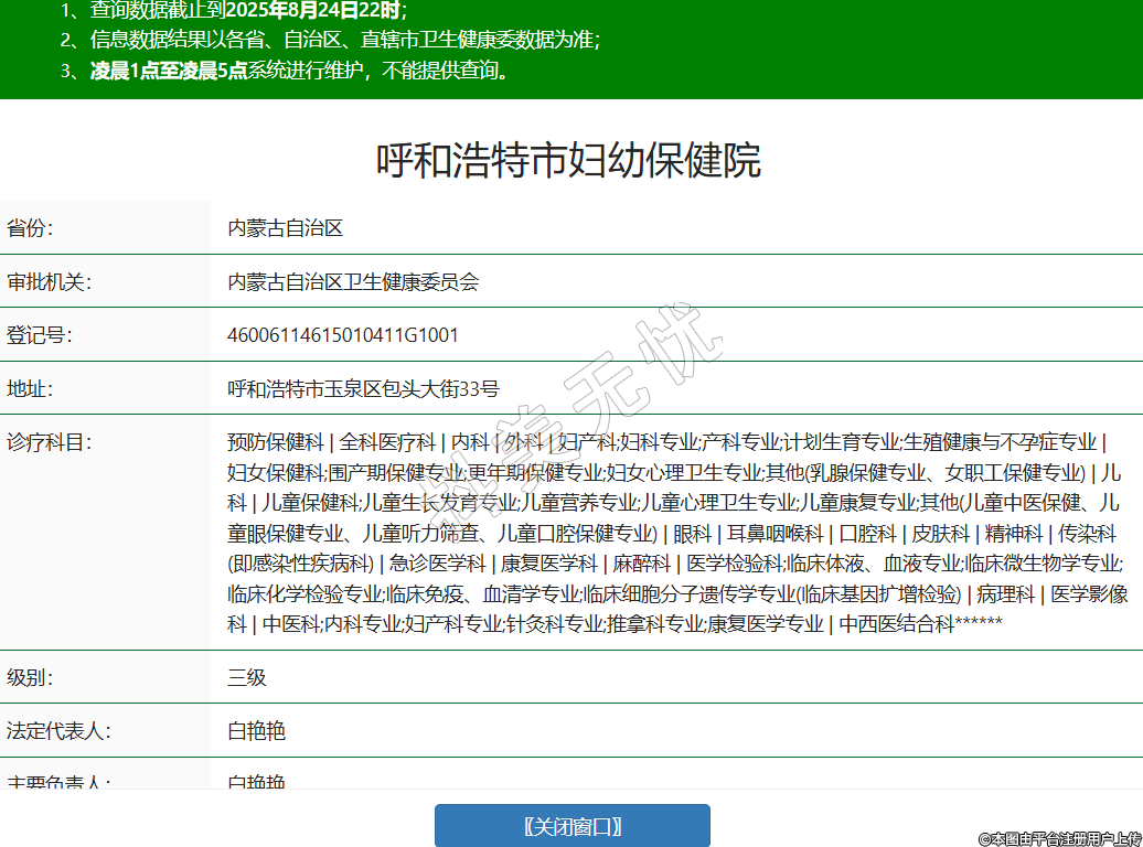 省份:內(nèi)蒙古自治區(qū)審批機關(guān):內(nèi)蒙古自治區(qū)衛(wèi)生健康委員會登記號:46006114615010411G1001地址:呼和浩特市玉泉區(qū)包頭大街33號診療科目:預防保健科 | 全科醫(yī)療科 | 內(nèi)科 | 外科 | 婦產(chǎn)科;婦科專業(yè);產(chǎn)科專業(yè);計劃生育專業(yè);生殖健康與不孕癥專業(yè) | 婦女保健科;圍產(chǎn)期保健專業(yè);更年期保健專業(yè);婦女心理衛(wèi)生專業(yè);其他(乳腺保健專業(yè)、女職工保健專業(yè)) | 兒科 | 兒童保健科;兒童生長發(fā)育專業(yè);兒童營養(yǎng)專業(yè);兒童心理衛(wèi)生專業(yè);兒童康復專業(yè);其他(兒童中醫(yī)保健、兒童眼保健專業(yè)、兒童聽力篩查、兒童口腔保健專業(yè)) | 眼科 | 耳鼻咽喉科 | 口腔科 | 皮膚科 | 精神科 | 傳染科(即感染性疾病科) | 急診醫(yī)學科 | 康復醫(yī)學科 | 麻醉科 | 醫(yī)學檢驗科;臨床體液、血液專業(yè);臨床微生物學專業(yè);臨床化學檢驗專業(yè);臨床免疫、血清學專業(yè);臨床細胞分子遺傳學專業(yè)(臨床基因擴增檢驗) | 病理科 | 醫(yī)學影像科 | 中醫(yī)科;內(nèi)科專業(yè);婦產(chǎn)科專業(yè);針灸科專業(yè);推拿科專業(yè);康復醫(yī)學專業(yè) | 中西醫(yī)結(jié)合科******級別:三級法定代表人:白艷艷主要負責人:白艷艷執(zhí)業(yè)許可證有效期:2024/11/19 -至- 2036/10/07 -