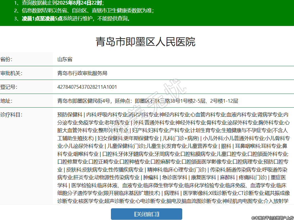 省份:山東省審批機(jī)關(guān):青島市行政審批服務(wù)局登記號(hào):42784075437028211A1001地址:青島市即墨區(qū)健民街4號(hào),延伸點(diǎn):即墨區(qū)石林三路38號(hào)1號(hào)樓2-5層、2號(hào)樓1-12層診療科目:預(yù)防保健科 | 內(nèi)科;呼吸內(nèi)科專業(yè);消化內(nèi)科專業(yè);神經(jīng)內(nèi)科專業(yè);心血管內(nèi)科專業(yè);血液內(nèi)科專業(yè);腎病學(xué)專業(yè);內(nèi)分泌專業(yè);免疫學(xué)專業(yè);老年病專業(yè) | 外科;普通外科專業(yè);神經(jīng)外科專業(yè);骨科專業(yè);泌尿外科專業(yè);胸外科專業(yè);心臟大血管外科專業(yè);整形外科專業(yè) | 婦產(chǎn)科;婦科專業(yè);產(chǎn)科專業(yè);計(jì)劃生育專業(yè);生殖健康與不孕癥專業(yè)(不含人工輔助生殖技術(shù)) | 婦女保健科;更年期保健專業(yè) | 兒科(門診+病房) | 小兒外科;小兒普通外科專業(yè);小兒骨科專業(yè);小兒泌尿外科專業(yè) | 兒童保健科(門診);兒童生長(zhǎng)發(fā)育專業(yè);兒童營(yíng)養(yǎng)專業(yè) | 眼科 | 耳鼻咽喉科;耳科專業(yè);鼻科專業(yè);咽喉科專業(yè) | 口腔科;牙體牙髓病專業(yè);牙周病專業(yè);口腔粘膜病專業(yè);兒童口腔專業(yè);口腔頜面外科專業(yè);口腔修復(fù)專業(yè);口腔正畸專業(yè);口腔種植專業(yè);口腔麻醉專業(yè);口腔頜面醫(yī)學(xué)影像專業(yè);口腔病理專業(yè);預(yù)防口腔專業(yè) | 皮膚科;皮膚病專業(yè);性傳播疾病專業(yè) | 精神科;臨床心理專業(yè)(門診) | 傳染科;腸道傳染病專業(yè);呼吸道傳染病專業(yè);肝炎專業(yè);動(dòng)物源性傳染病專業(yè) | 腫瘤科 | 急診醫(yī)學(xué)科 | 康復(fù)醫(yī)學(xué)科 | 麻醉科 | 疼痛科(門診) | 重癥醫(yī)學(xué)科 | 醫(yī)學(xué)檢驗(yàn)科;臨床體液、血液專業(yè);臨床微生物學(xué)專業(yè);臨床化學(xué)檢驗(yàn)專業(yè);臨床免疫、血清學(xué)專業(yè);臨床細(xì)胞分子遺傳學(xué)專業(yè)(限開展臨床基因擴(kuò)增技術(shù)) | 病理科 | 醫(yī)學(xué)影像科;X線診斷專業(yè);CT診斷專業(yè);磁共振成像診斷專業(yè);核醫(yī)學(xué)專業(yè);超聲診斷專業(yè);心電診斷專業(yè);腦電及腦血流圖診斷專業(yè);神經(jīng)肌肉電圖專業(yè);介入放射學(xué)專業(yè);放射治療專業(yè) | 中醫(yī)科;內(nèi)科專業(yè);外科專業(yè);婦產(chǎn)科專業(yè);骨傷科專業(yè);肛腸科專業(yè);針灸科專業(yè);推拿科專業(yè);康復(fù)醫(yī)學(xué)專業(yè)******級(jí)別:三級(jí)法定代表人:姜尊平主要負(fù)責(zé)人:宋啟京執(zhí)業(yè)許可證有效期:2018/09/19 -至- 2031/06/23 -