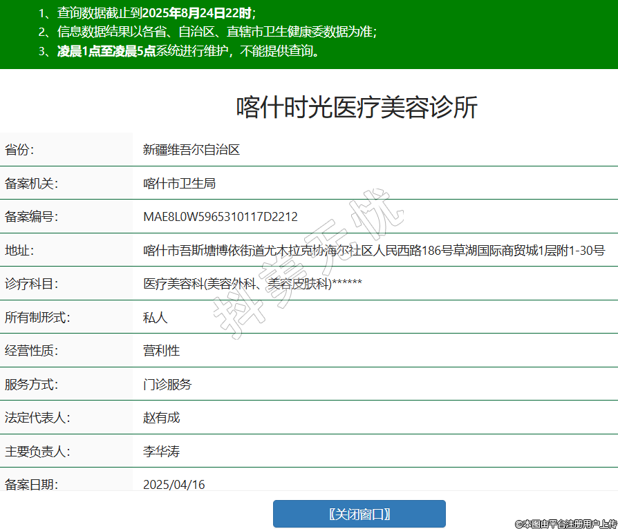 省份:新疆維吾爾自治區(qū)備案機(jī)關(guān):喀什市衛(wèi)生局備案編號(hào):MAE8L0W5965310117D2212地址:喀什市吾斯塘博依街道尤木拉克協(xié)海爾社區(qū)人民西路186號(hào)草湖國(guó)際商貿(mào)城1層附1-30號(hào)診療科目:醫(yī)療美容科(美容外科、美容皮膚科)******所有制形式:私人經(jīng)營(yíng)性質(zhì):營(yíng)利性服務(wù)方式:門診服務(wù)法定代表人:趙有成主要負(fù)責(zé)人:李華濤備案日期:2025/04/16 -