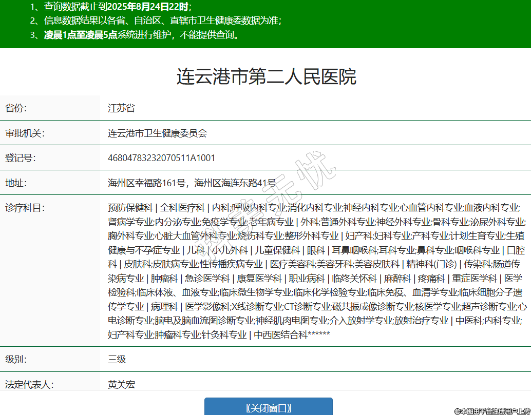 省份:江蘇省審批機(jī)關(guān):連云港市衛(wèi)生健康委員會(huì)登記號(hào):46804783232070511A1001地址:海州區(qū)幸福路161號(hào),海州區(qū)海連東路41號(hào)診療科目:預(yù)防保健科 | 全科醫(yī)療科 | 內(nèi)科;呼吸內(nèi)科專業(yè);消化內(nèi)科專業(yè);神經(jīng)內(nèi)科專業(yè);心血管內(nèi)科專業(yè);血液內(nèi)科專業(yè);腎病學(xué)專業(yè);內(nèi)分泌專業(yè);免疫學(xué)專業(yè);老年病專業(yè) | 外科;普通外科專業(yè);神經(jīng)外科專業(yè);骨科專業(yè);泌尿外科專業(yè);胸外科專業(yè);心臟大血管外科專業(yè);燒傷科專業(yè);整形外科專業(yè) | 婦產(chǎn)科;婦科專業(yè);產(chǎn)科專業(yè);計(jì)劃生育專業(yè);生殖健康與不孕癥專業(yè) | 兒科 | 小兒外科 | 兒童保健科 | 眼科 | 耳鼻咽喉科;耳科專業(yè);鼻科專業(yè);咽喉科專業(yè) | 口腔科 | 皮膚科;皮膚病專業(yè);性傳播疾病專業(yè) | 醫(yī)療美容科;美容牙科;美容皮膚科 | 精神科(門診) | 傳染科;腸道傳染病專業(yè) | 腫瘤科 | 急診醫(yī)學(xué)科 | 康復(fù)醫(yī)學(xué)科 | 職業(yè)病科 | 臨終關(guān)懷科 | 麻醉科 | 疼痛科 | 重癥醫(yī)學(xué)科 | 醫(yī)學(xué)檢驗(yàn)科;臨床體液、血液專業(yè);臨床微生物學(xué)專業(yè);臨床化學(xué)檢驗(yàn)專業(yè);臨床免疫、血清學(xué)專業(yè);臨床細(xì)胞分子遺傳學(xué)專業(yè) | 病理科 | 醫(yī)學(xué)影像科;X線診斷專業(yè);CT診斷專業(yè);磁共振成像診斷專業(yè);核醫(yī)學(xué)專業(yè);超聲診斷專業(yè);心電診斷專業(yè);腦電及腦血流圖診斷專業(yè);神經(jīng)肌肉電圖專業(yè);介入放射學(xué)專業(yè);放射治療專業(yè) | 中醫(yī)科;內(nèi)科專業(yè);婦產(chǎn)科專業(yè);腫瘤科專業(yè);針灸科專業(yè) | 中西醫(yī)結(jié)合科******級(jí)別:三級(jí)法定代表人:黃關(guān)宏主要負(fù)責(zé)人:黃宏志執(zhí)業(yè)許可證有效期:2022/01/18 -至- 2037/01/17 -