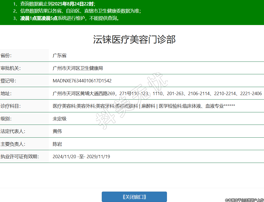 省份:廣東省審批機關(guān):廣州市天河區(qū)衛(wèi)生健康局登記號:MADNXE76344010617D1542地址:廣州市天河區(qū)黃埔大道西路269,271號110-123、1110、201-263、2106-2114、2210-2214、2221-2406診療科目:醫(yī)療美容科;美容外科;美容牙科;美容皮膚科 | 麻醉科 | 醫(yī)學(xué)檢驗科;臨床體液、血液專業(yè)******級別:未定級法定代表人:黃偉主要負責(zé)人:陳巖執(zhí)業(yè)許可證有效期:2024/11/20 -至- 2029/11/19 -