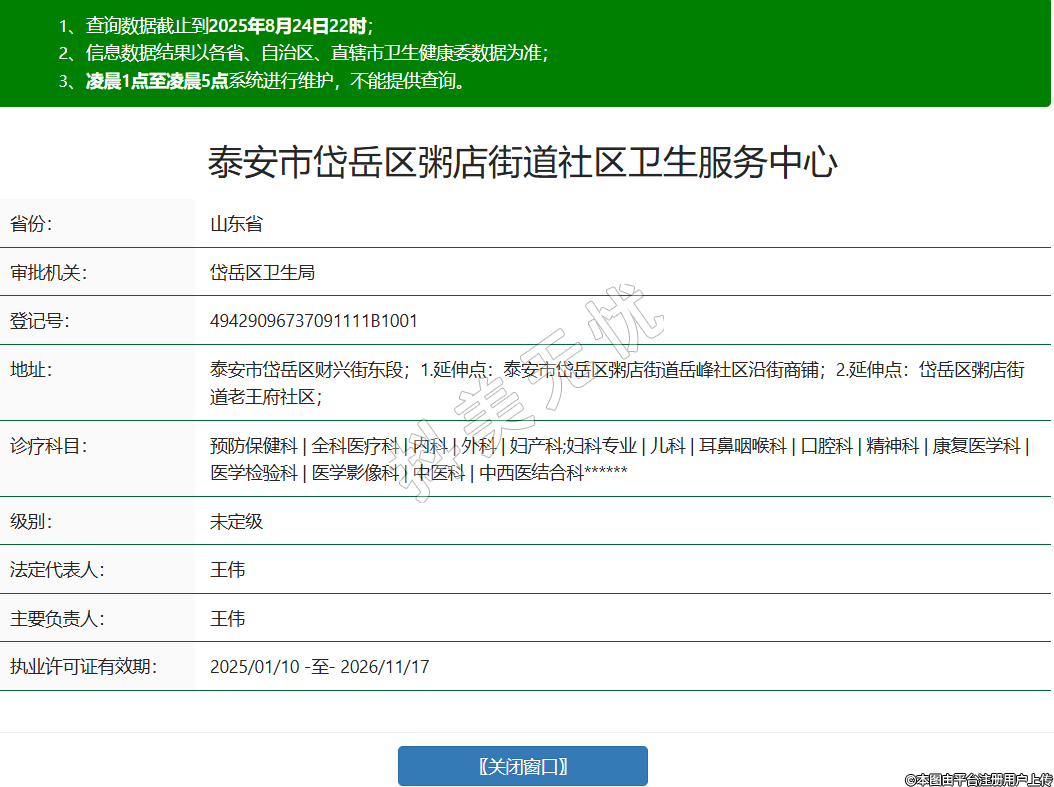 省份:山東省審批機關:岱岳區(qū)衛(wèi)生局登記號:49429096737091111B1001地址:泰安市岱岳區(qū)財興街東段;1.延伸點:泰安市岱岳區(qū)粥店街道岳峰社區(qū)沿街商鋪;2.延伸點:岱岳區(qū)粥店街道老王府社區(qū);診療科目:預防保健科 | 全科醫(yī)療科 | 內(nèi)科 | 外科 | 婦產(chǎn)科;婦科專業(yè) | 兒科 | 耳鼻咽喉科 | 口腔科 | 精神科 | 康復醫(yī)學科 | 醫(yī)學檢驗科 | 醫(yī)學影像科 | 中醫(yī)科 | 中西醫(yī)結合科******級別:未定級法定代表人:王偉主要負責人:王偉執(zhí)業(yè)許可證有效期:2025/01/10 -至- 2026/11/17 -