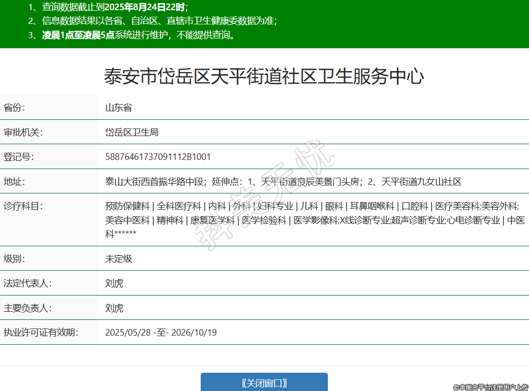 省份:山東省審批機(jī)關(guān):岱岳區(qū)衛(wèi)生局登記號(hào):58876461737091112B1001地址:泰山大街西首振華路中段;延伸點(diǎn):1、天平街道良辰美景門頭房;2、天平街道九女山社區(qū)診療科目:預(yù)防保健科 | 全科醫(yī)療科 | 內(nèi)科 | 外科 | 婦科專業(yè) | 兒科 | 眼科 | 耳鼻咽喉科 | 口腔科 | 醫(yī)療美容科;美容外科;美容中醫(yī)科 | 精神科 | 康復(fù)醫(yī)學(xué)科 | 醫(yī)學(xué)檢驗(yàn)科 | 醫(yī)學(xué)影像科;X線診斷專業(yè);超聲診斷專業(yè);心電診斷專業(yè) | 中醫(yī)科******級(jí)別:未定級(jí)法定代表人:劉虎主要負(fù)責(zé)人:劉虎執(zhí)業(yè)許可證有效期:2025/05/28 -至- 2026/10/19 -