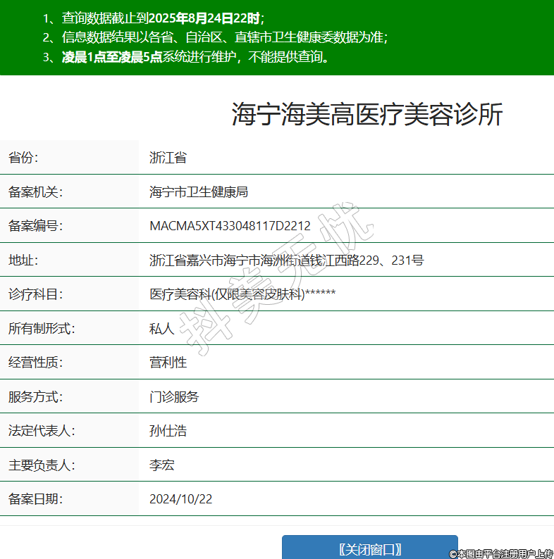 省份:浙江省備案機(jī)關(guān):海寧市衛(wèi)生健康局備案編號(hào):MACMA5XT433048117D2212地址:浙江省嘉興市海寧市海洲街道錢(qián)江西路229、231號(hào)診療科目:醫(yī)療美容科(僅限美容皮膚科)******所有制形式:私人經(jīng)營(yíng)性質(zhì):營(yíng)利性服務(wù)方式:門(mén)診服務(wù)法定代表人:孫仕浩主要負(fù)責(zé)人:李宏備案日期:2024/10/22 -